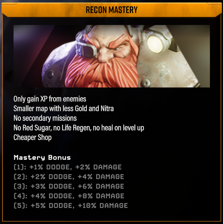 Class Mod Masteries Class Mod Masteries unlock after completing a Hazard 2 dive with a specific class mod, and there are of course 12 of them - one for each class mod. These masteries are regular 5-stage dives, but they come with an array of added challenges, most notably the inability to heal during a stage. That’s right: No red sugar, no life regeneration, and no healing when you level up. These are combat-oriented masteries where the stage area is smaller, there are fewer minerals to mine, fewer supply drops, and many more Huuli Hoarders! Each completed Class Mod Mastery will give a permanent passive bonus to that class mod across all game modes.