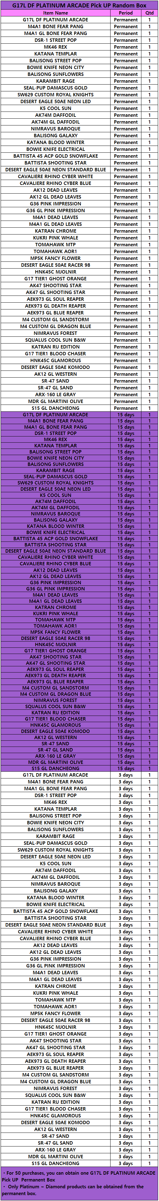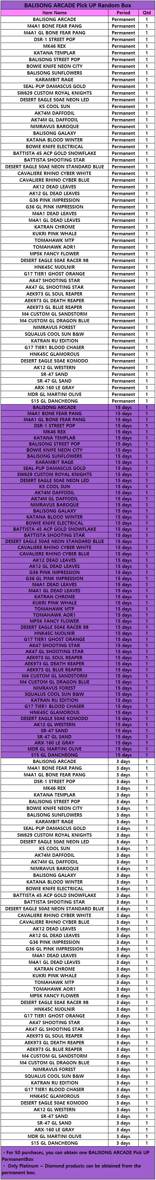 ARCADE Series Updates ▶ BALISONG ARCADE ※ A random box of new weapon products that can be purchased at a discounted price once a day is added. ※ When purchasing this item, the permanent random box acquisition count for the series increases. ※ The permanent random box count is shared during the sales period for items of the same series. ※ Only Platinum ~ Diamond products can be obtained from the permanent box of the series. ▶ Sale period: July 1, 2024 00::00 - July 8, 2024 05:00 (UTC)
