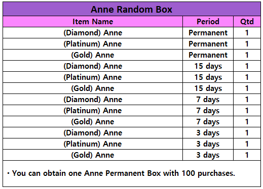 New Character Update ▶ Sales of Anne characters begin. ※ Sales period: After maintenance on June 27, 2024 - until 05:00 on July 11, 2024 (UTC)