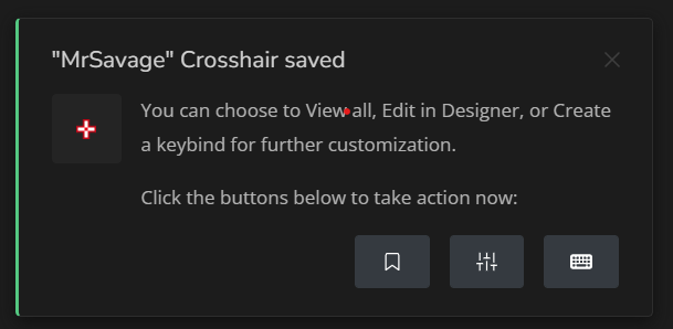 Save a crosshair with a single click! After saving, a message will appear, allowing you to explore other awesome crosshairs from our community. From this message you can: