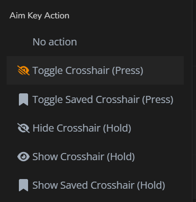 Hide Crosshair (Hold): Holding the aim key will hide the crosshair.