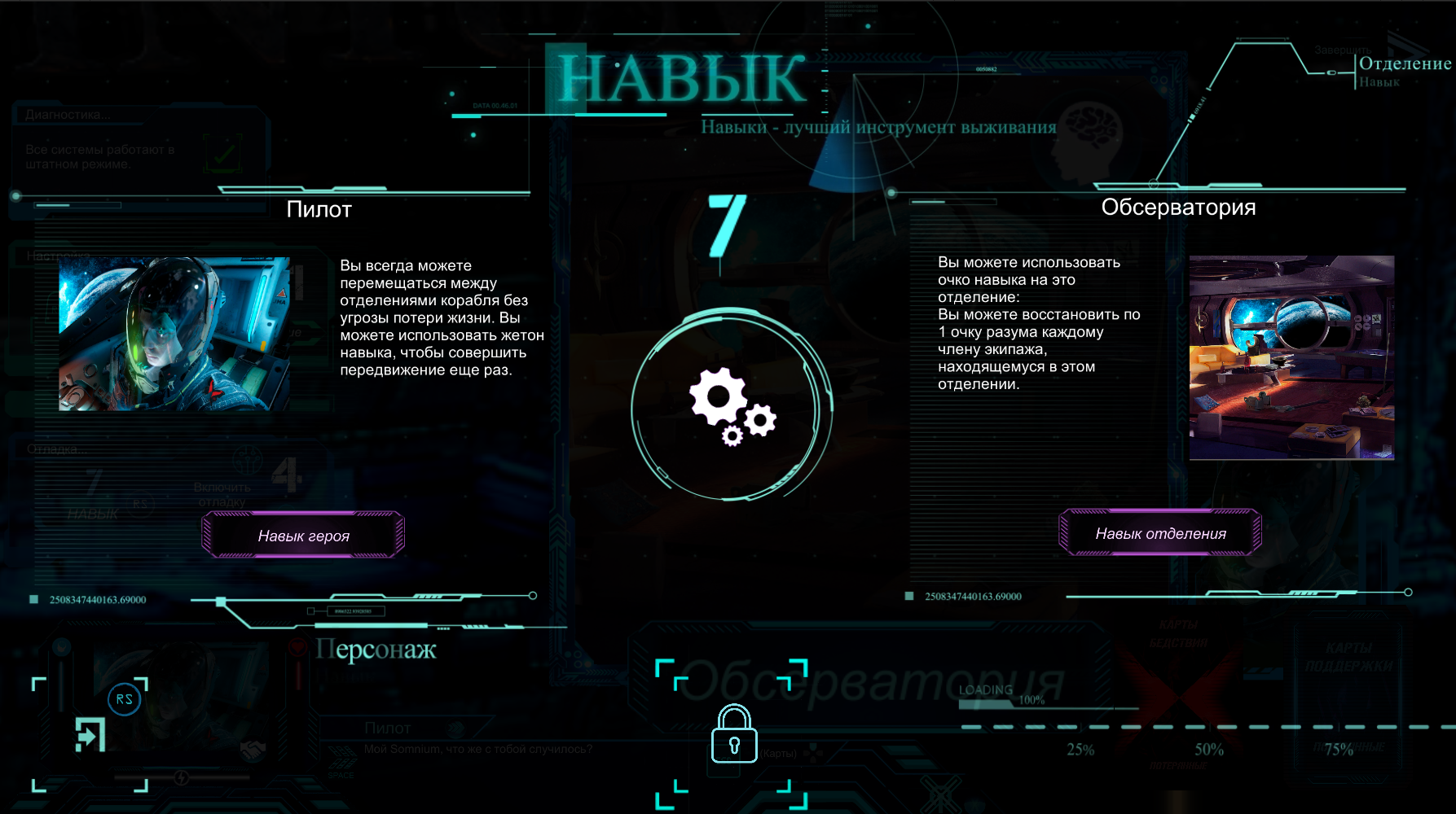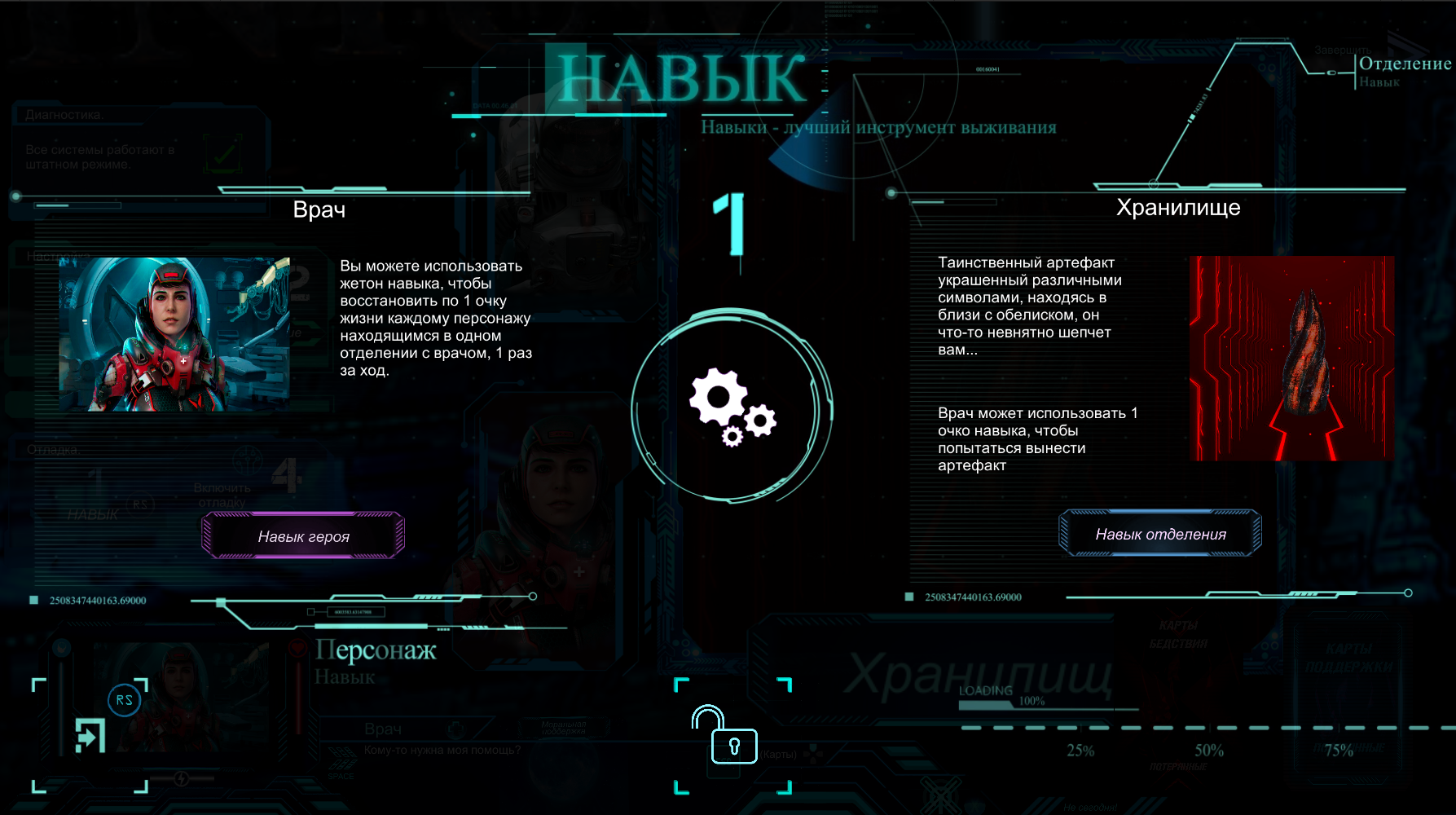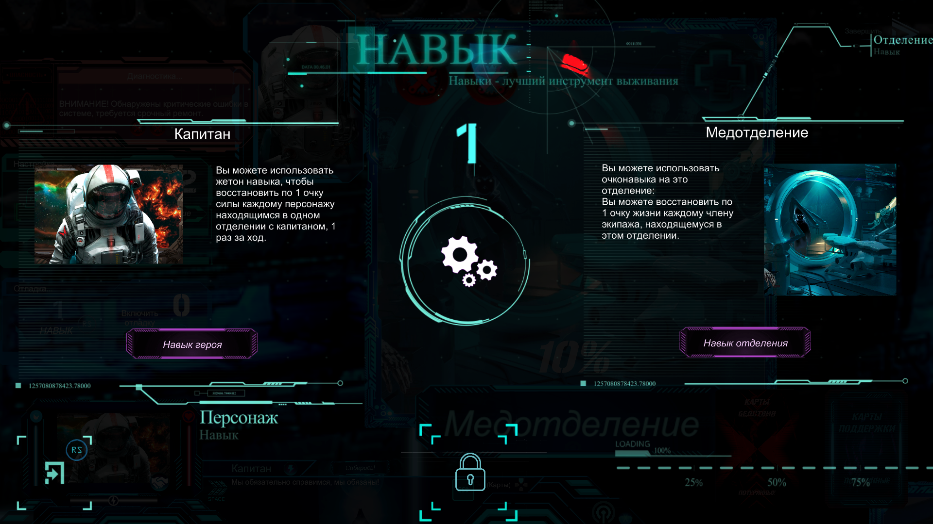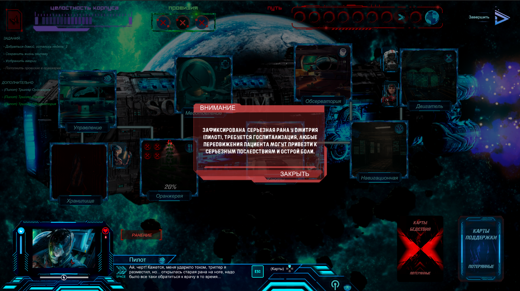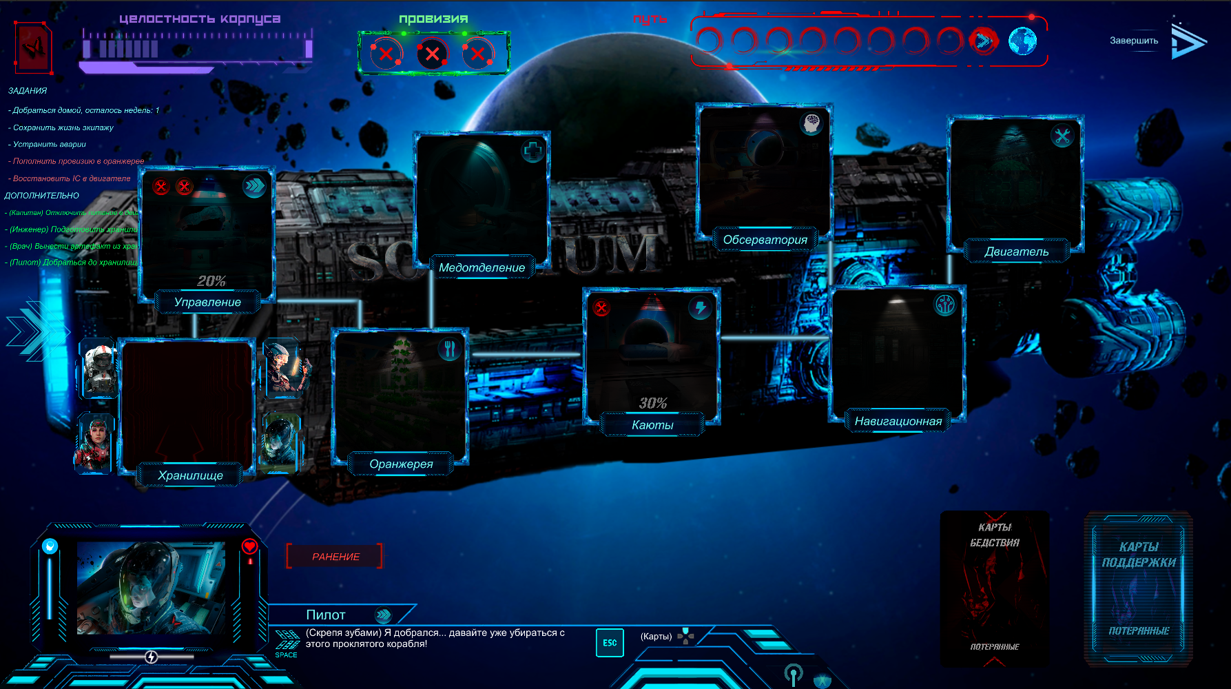 Dmitry's goal is to place triggers in 3 compartments: Greenhouse, Crew Quarters and Observatory. To do this, Dmitry must open the lock in each compartment in the skill menu for a skill point. It will be difficult to do this, since Dmitry’s old wound will open from the high load. Remember Dmitry’s story at the very beginning of the company. Dmitry receives the special status “Wounded”. It will be with him until the end of the game. Dmitry will receive 1 wound every time he moves.