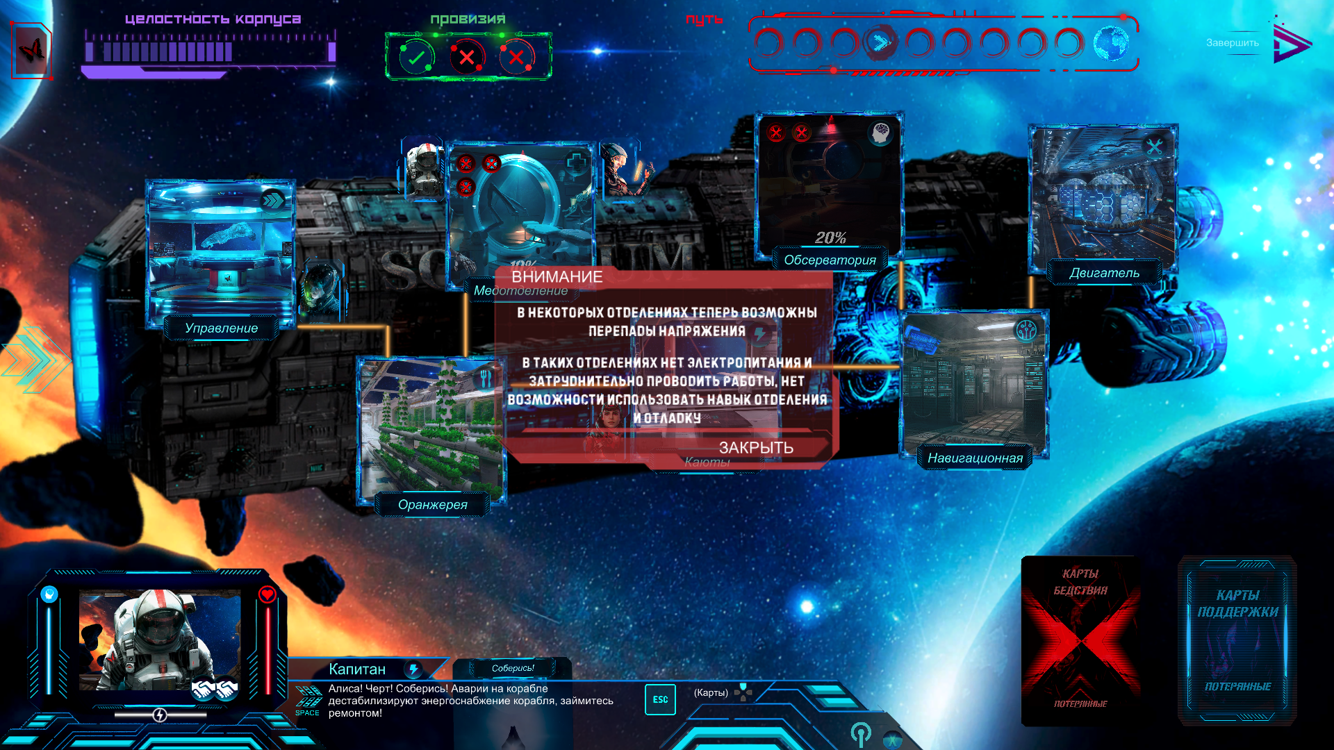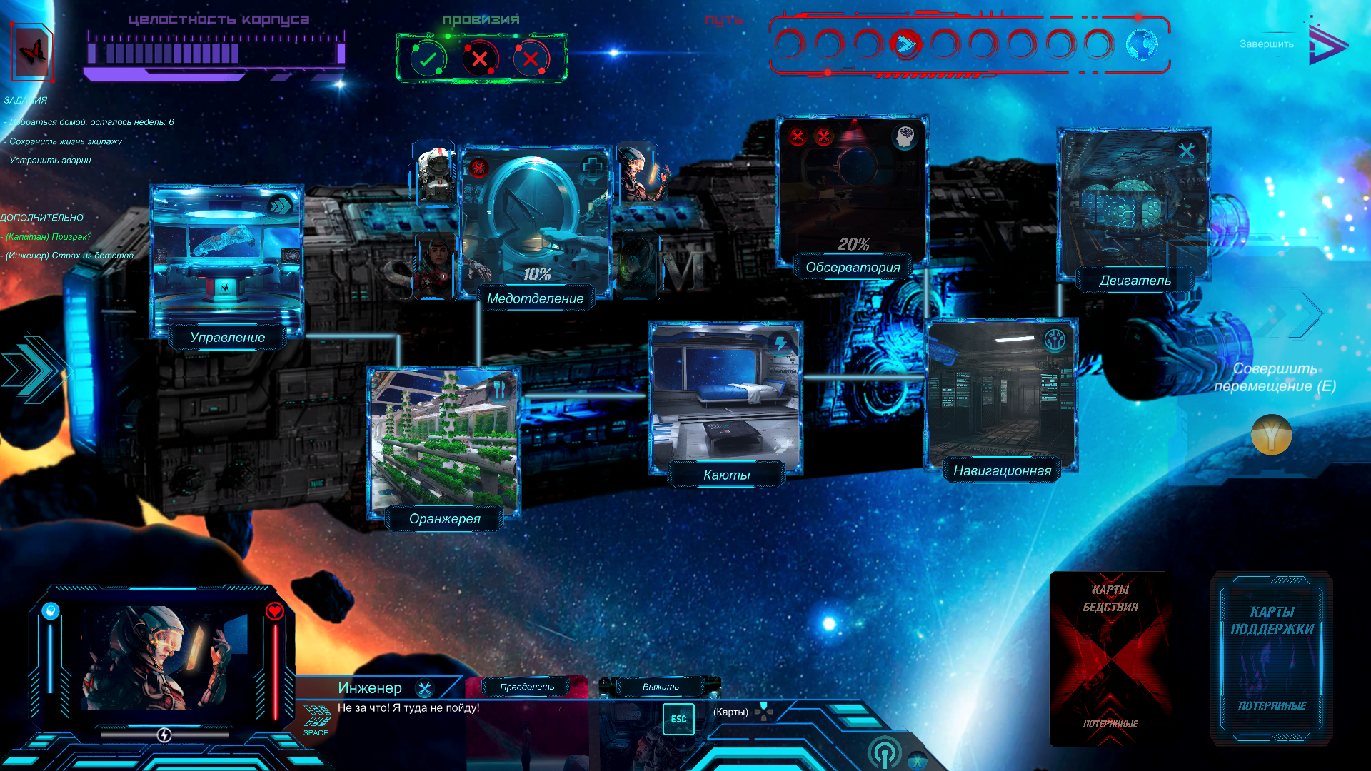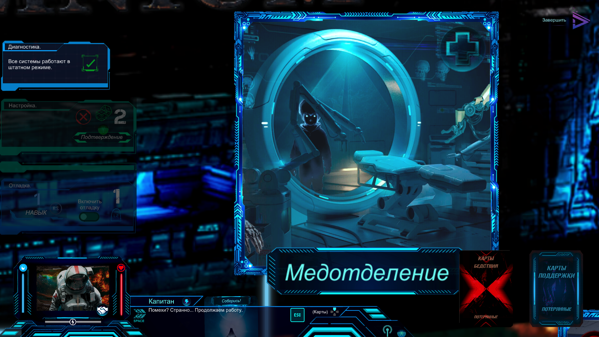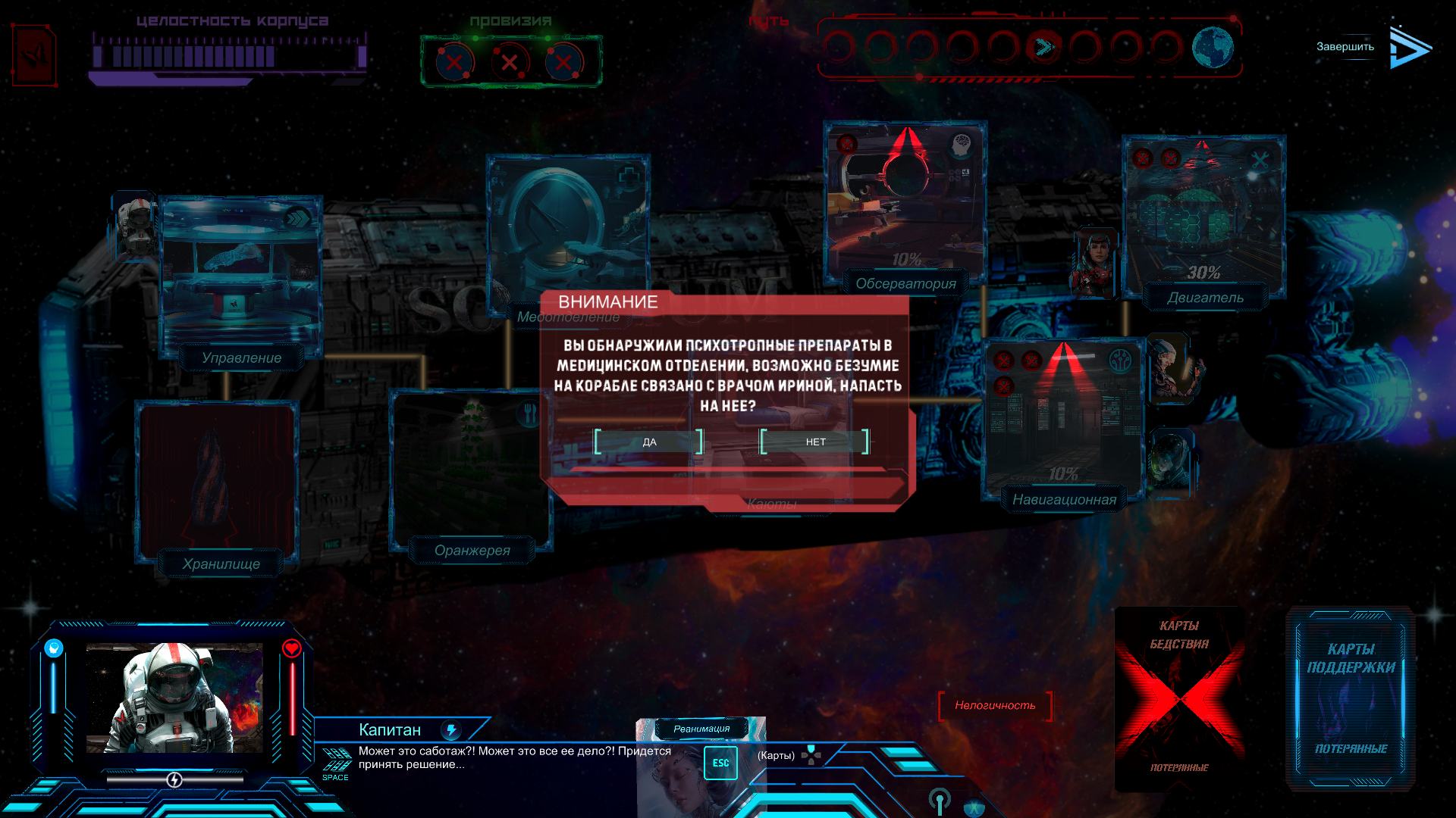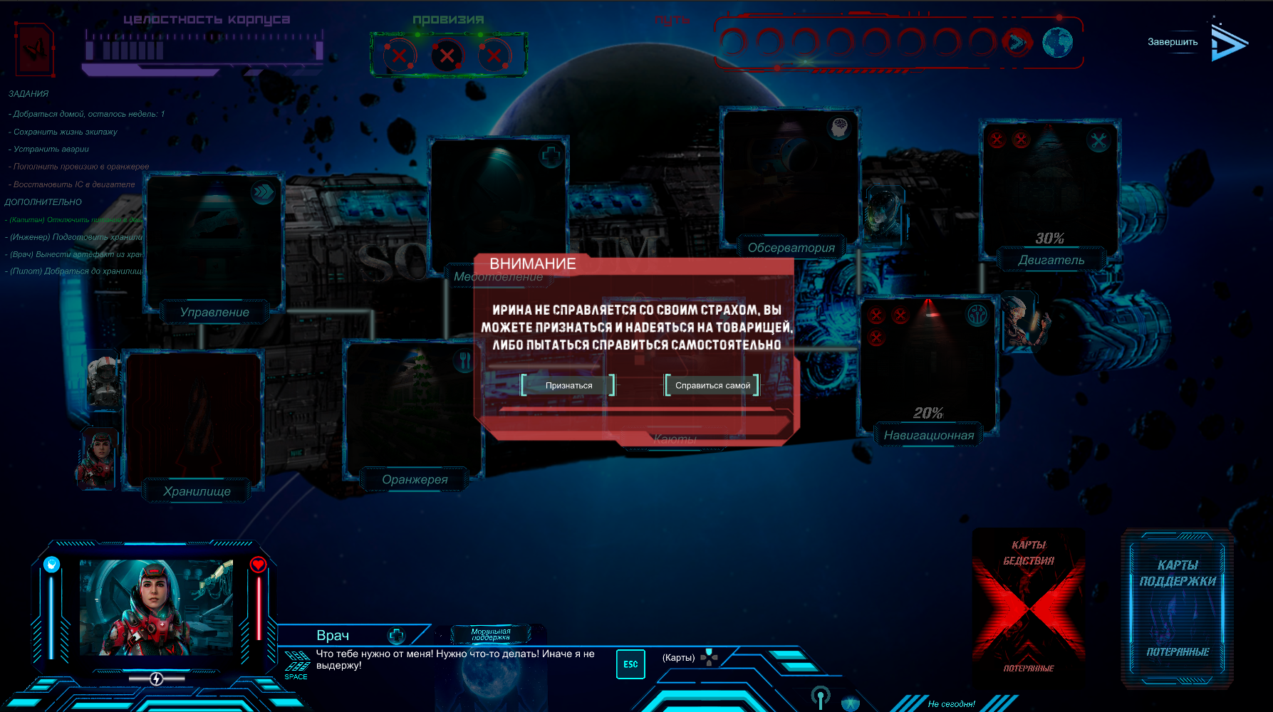 The crew continues to lose their minds, and it becomes obvious that this is not an accident, but a pattern. The only question is, what can influence the mind? The captain suspects doctor Irina. Obviously, she is hiding something and maybe she knows everything? Maybe she is deliberately sabotaging the team with drugs? The player has a choice: attack Irina or refuse it. If the player refuses, it will be the correct choice. We will guess the answer to Irina’s behavior later. If the player decides to attack Irina, the Captain will brutally kill her. You can still resurrect her with support cards, but Irina's death will affect the rest of the story.