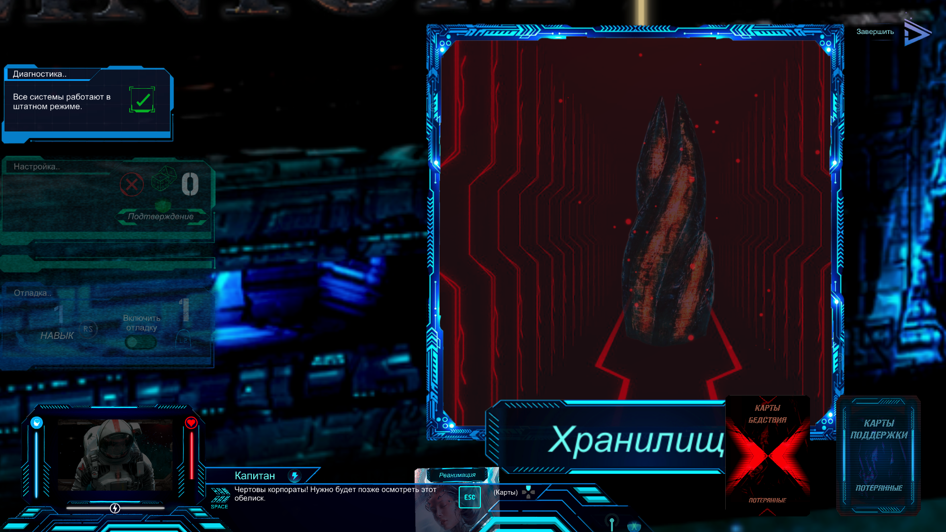 Irina will touch the obelisk, and in response, the obelisk will start a conversation with Irina, driving her crazy. Here we learn that Irina, being a doctor, took illegal drugs, was dependent on them and skillfully hid it. The obelisk drives Irina crazy. The Player again faces a choice: try to cope with the madness on his own or tell the crew about everything and, with the help of support, cope with the test.