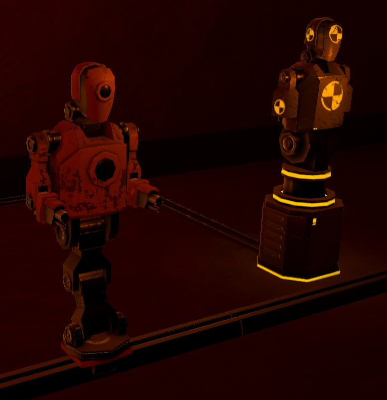 Now for the remaining final touches on the Main Menu. I'm reworking the dummies to be more flexible (I already had a first approach to them with the now-discarded Halloween Murderbot event). I plan on reusing them on the upcoming Research and Development zone (as it's weapon-testing themed) and the future Firing Range, so I'm making sure they'll be fun to disassemble. Here's a preview!