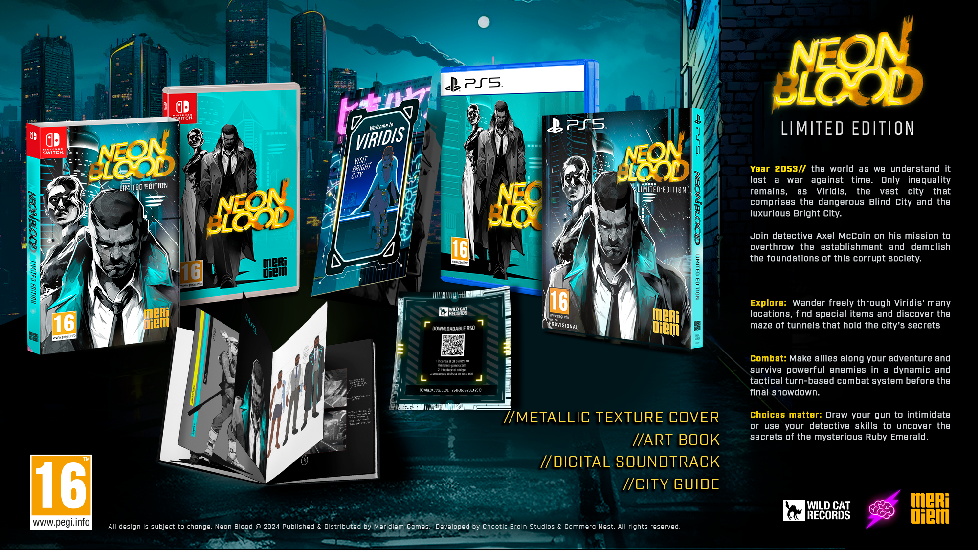 In addition to digital editions, Meridiem announced the release of the boxed edition of Neon Blood, available in specialized stores in the fourth quarter of 2024. The boxed Limited Edition for PlayStation 5 and Nintendo Switch includes a metallic-textured cover, an art book, a city guide, and a downloadable soundtrack.