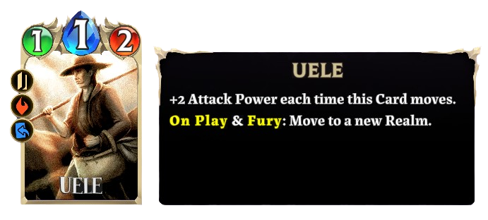 +2 Attack Power each time this Card moves. On Play & Fury: Move to a new Realm.