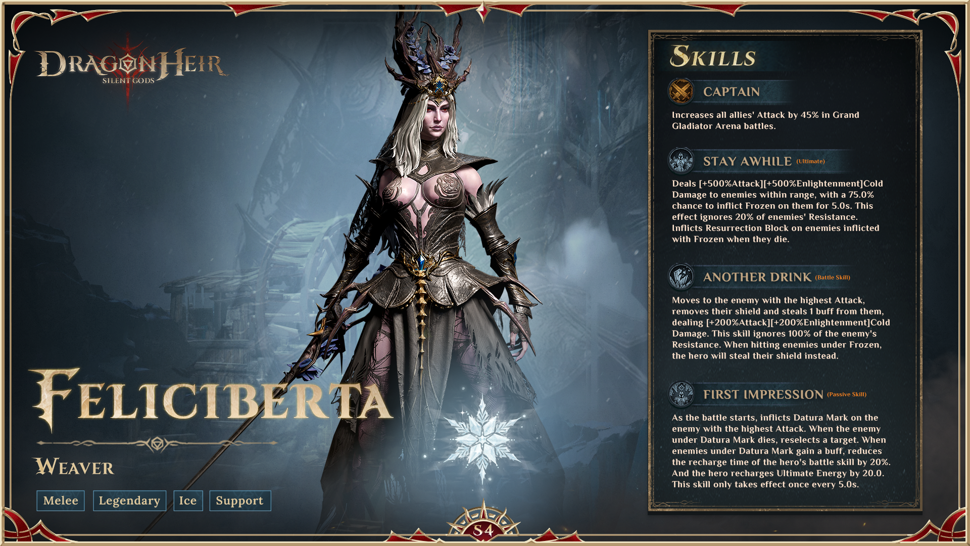 Feliciberta, a mysterious figure renowned for her mastery of ice and cunning strategies, enters the fray. Her unique abilities focus on controlling the battlefield, disrupting enemy tactics, and empowering her allies. With her Captain skill boosting her team's Attack in the Grand Gladiator Arena, her Ultimate freezing and hindering foes, and her Battle Skill stealing buffs, Feliciberta is a force to be reckoned with.