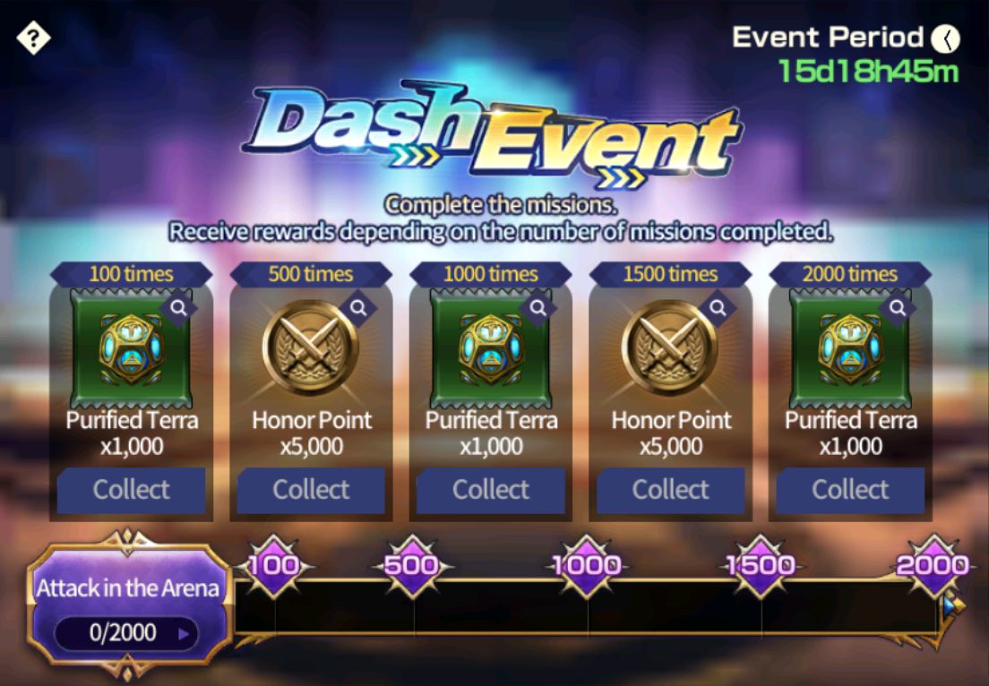 4. Dash Event July 11, 2024 (Thu) after maintenance - August 8 (Thu), 13:00 You can get rewards based on the Arena total play count during the event period.