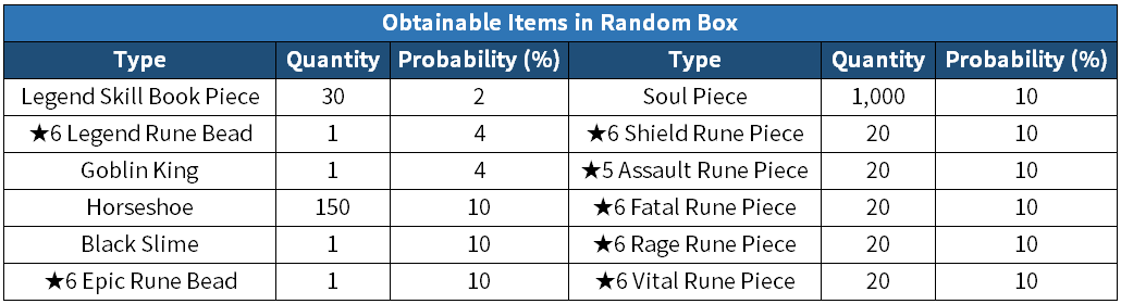 5. Ice Lucky Box Drop Event July 11, 2024 (Thu) after maintenance - August 8 (Thu), 13:00 There is a certain chance for the random box item to drop upon victory in Campaign, Arena, Novice Arena, World Arena, or Rune Temple.