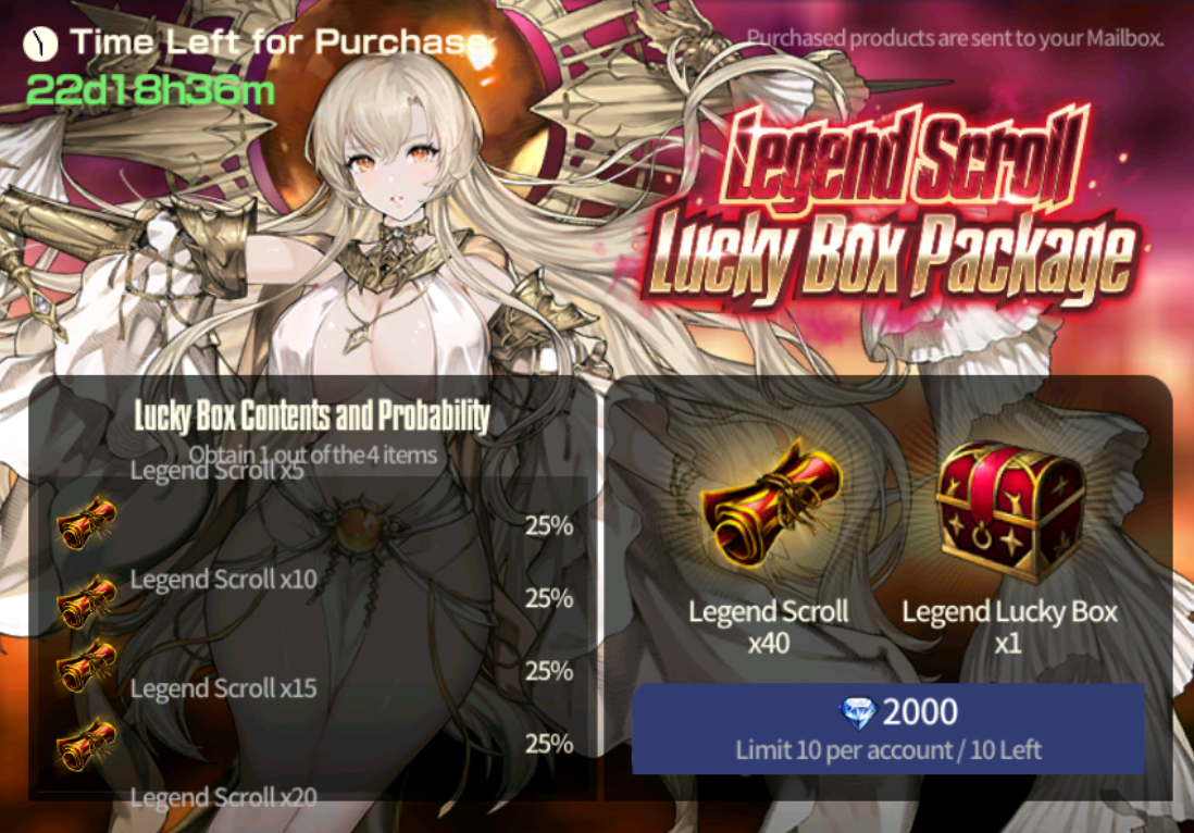 5. Legend Scroll Lucky Box Package - 10 per account (Diamond x2,000) July 11, 2024 (Thu) after maintenance - August 8 (Thu), 13:00 There is a 25% chance to obtain 5, 10, 15, or 20 Legend Scrolls from the Lucky Box.