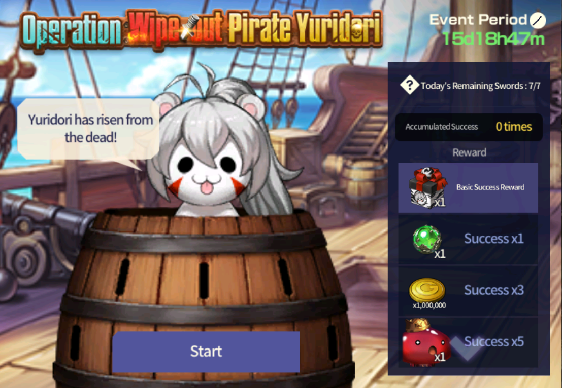 3. Operation Wipe-out Pirate Yuridori July 11, 2024 (Thu) after maintenance - August 8 (Thu), 13:00 Use Toy Swords to make Yuridori appear and earn basic success rewards. Additional cumulative rewards are available based on the number of successes in each round. Seven Toy Swords are provided daily and reset at 5:00. Watch ads to earn up to seven additional swords each day. There is a 5 minute cooldown for each Toy Sword used. The cumulative success rewards must be claimed by tapping the [Collect] button. They cannot be claimed once the event ends.
