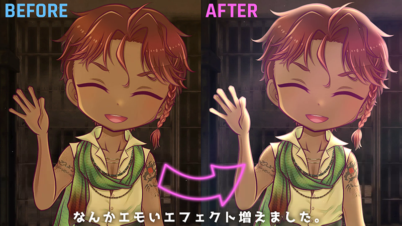 Following the last Live2D update, the game visuals were powered up with a surprise! Smoothly animated Live2D characters are retained, but backlighting effects are added.