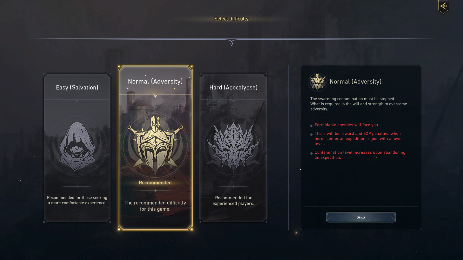 【New Difficulty Modes】 ◌ 2 new difficulty modes have been added: Easy (Salvation) and Hard (Apocalypse). ◌ The default difficulty is set to Normal (Adversity). ◌ Hard (Apocalypse) difficulty unlocks upon clearing either Easy (Salvation) or Normal (Adversity) mode.
