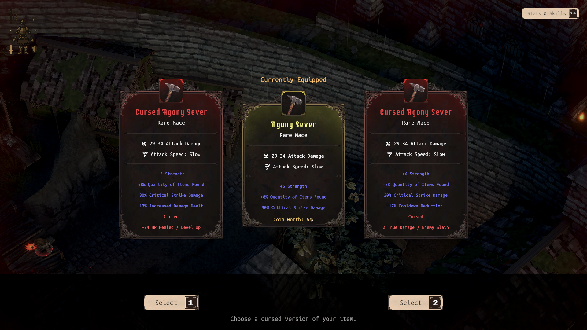 However, cursed items can't be replaced by normal means, meaning you won't be able to simply discard it by picking up another item for that slot. Instead, whenever you kill a Boss enemy, such as Matron Amara, one random Cursed item will be cleansed - it will retain one of the bonus stats, lose the detriments, and become discardable again.
