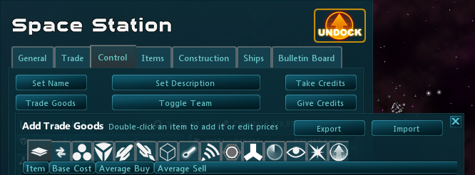 To Export, dock at your Station. Go to the Control tab. Press Trade Goods. Then press Export. This will open a window that allows you to copy paste the text for later importing. Follow the same process but press Import on the Add Trade Goods page when importing your template you’ve previously exported. This can be extremely useful for include things like your shop or a main production station, but also any trade bay that is worth re-using such as a colony or extraction setup.