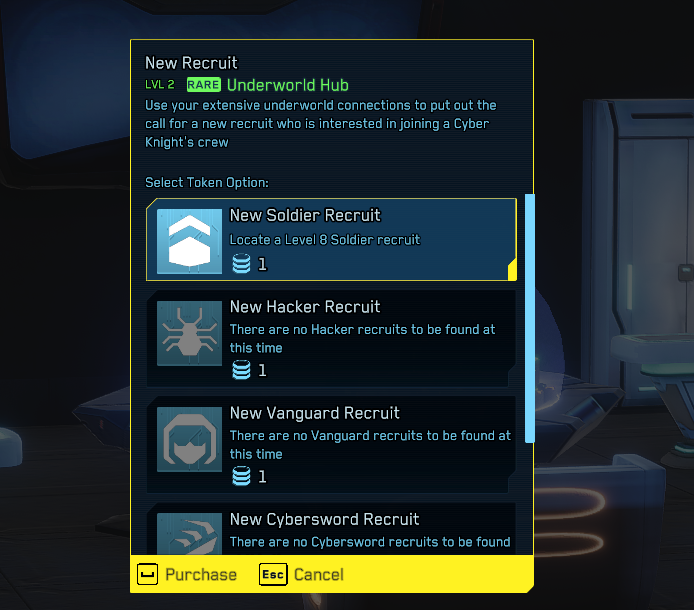 Now that recruit offers in the Underworld Hub are getting more interest, we've improved the UI to make the sub-offers more clear when they aren't available to pick. The Soldier and Cybersword recruits now visually leap out of the group, ready to pick. Good thing more are coming!