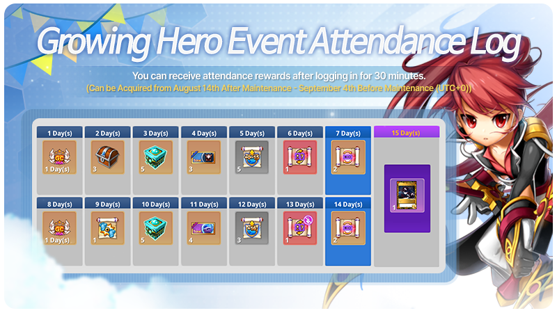 2. Growing Hero's Event 1) Growing Hero's Attendance Log - Players can acquire login rewards by logging in for 30 minutes daily for 15 days. - Players can acquire [Bloody Shadow] Monster Card, Single Stat Change Scroll, Single Stat Drop Protection Scroll, Another World Dungeon Entry Ticket, Hero Dungeon Entry Ticket, GP Item Property Scroll, Coordi Fusion Scroll, Reinforcement Protection Scroll.