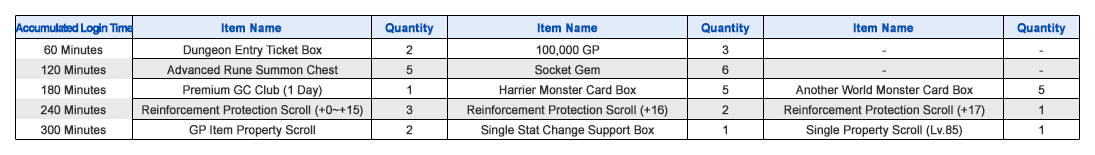 4. Accumulated Login Event - The time for Accumulated Login Event starts from the Character Selection after selecting the server. - Accumulated Login Event Time may be different from the Login Event Time due to Server Change and Character Change. (1) Week 1 (August 16th (Fri) 06:00 ~ August 19th (Mon) 06:00 (UTC+0)) (2) Week 2 (August 23rd (Fri) 06:00 ~ August 26th (Mon) 06:00 (UTC+0)) (3) Week 3 (August 30th (Fri) 06:00 ~ September 2nd (Mon) 06:00 (UTC+0)) - Upon 300 minutes of Accumulated Login, receive Single Stat Change Support Box, Single Property Scroll (Lv85), GP Item Property Scroll!