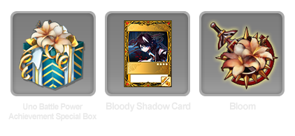 <Event> 1. Uno Battle Power Achievement Event (August 14th (Wed) After Maintenance ~ September 25th (Sun) Before Maintenance (UTC+0)) - Players can only participate with Uno, and players will be rewarded for each target Battle Power reached. - Upon achieving a certain amount of Battle Power, players can acquire [Uno Battle Power Achievement Special Box], [Bloody Shadow] Monster Card, [Bloom] Title depending on the stage. Players can also acquire Single Stat Change Support Box, [Corrupted Saint Gaian] Monster Card, Voidal Fragment of Taint, Voidal Fragment of Invasion, Raid Dungeon Entry Ticket, Single Property Scroll (Lv85), Reinforcement Scroll (+17), GP Item Property Scroll. - [Uno Battle Power Achievement Special Box] Contents: Players can acquire all: Group 7 Card Select Box x1, Single Stat Change Support Box x5, Single Property Scroll (Lv85), GP Item Property Scroll x10, Advanced Rune Summon Chest x30, 1,000,000 GP Coupon x5. - [Group 7 Card Select Box]: Consists of Monster Cards corresponding to Group 7 upon Card Fusion. Players can acquire it by selecting 1 of the contents. - [Group 7 Card Select Box] Content List