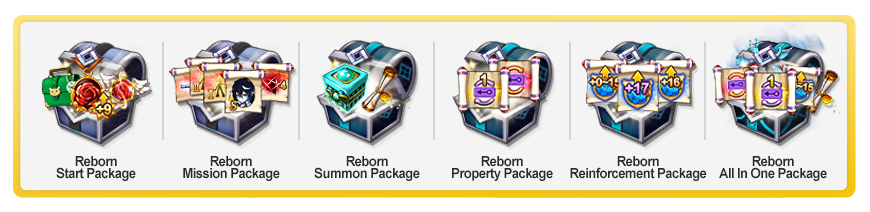 6) Reborn: All-In-One Package (Purchase Limit: 3) - Seal Breaker Scroll x450 - Reinforcement Protection Scroll (+0~+15) x30 - Single Property Scroll (Lv85) x5 - GP Item Property Scroll x10