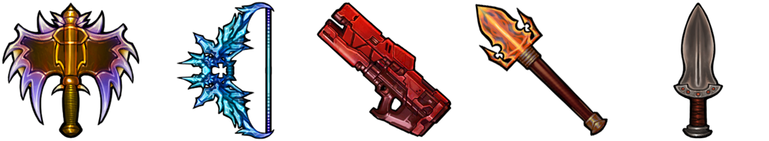 Dancing Spinning Axe (Legendary), Frost Essence (Legendary), Laser Gun (Legendary), Spear of Flame (Rare), and Primordial Sword (Uncommon)