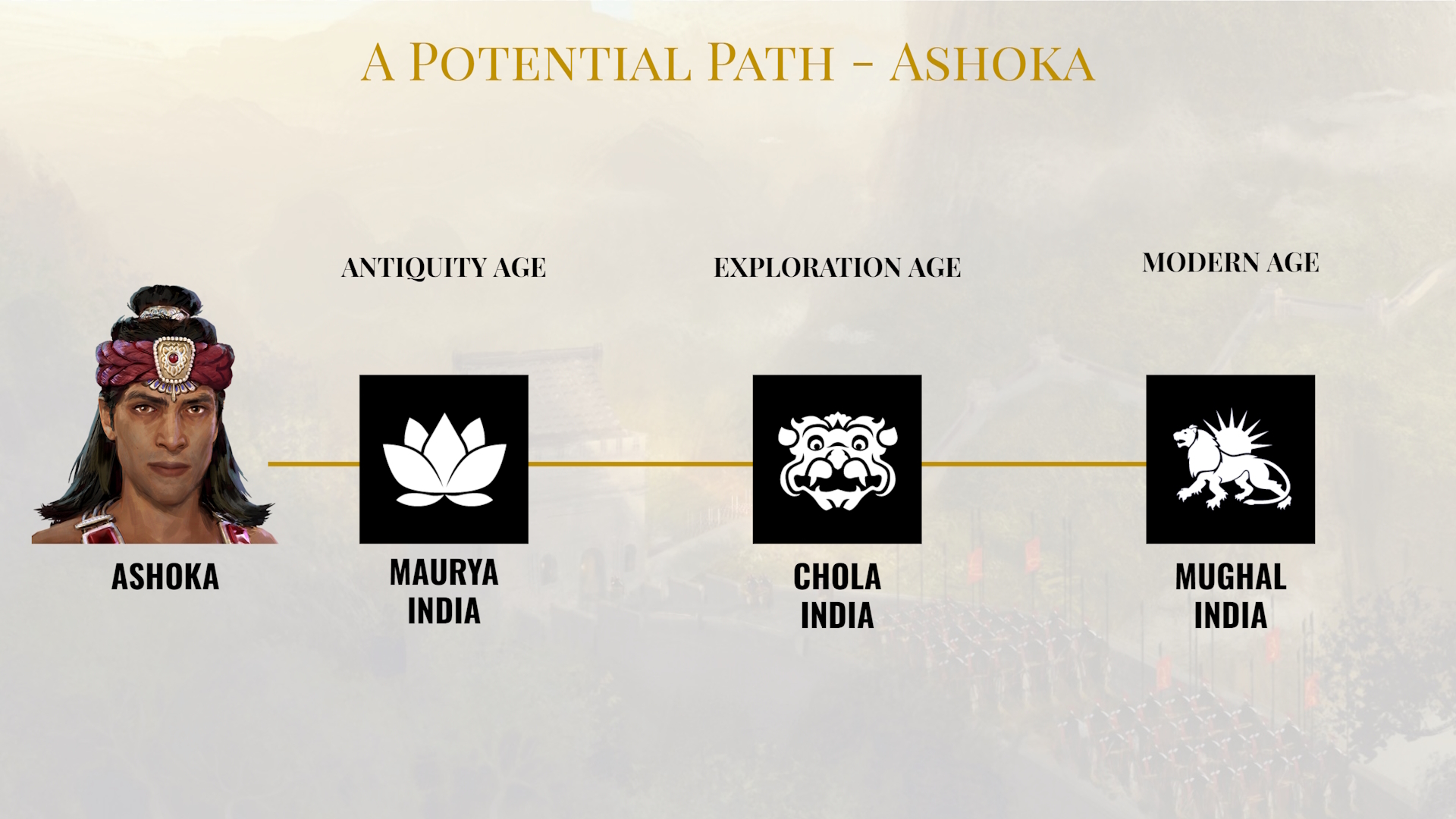 When it comes to selecting a new civilization in the new Age, you won't be able to choose just any new civ at random. There are three factors that determine your options. First, if there is a historical or geographical connection between the past civ and the future one, you'll have a choice that's more rooted in history. Some examples we've shared so far include Antiquity Egypt to Exploration Abbasid, as well as Maurya India to Chola India. Second, certain leaders will automatically unlock certain civs due to their particularly strong identities. Choosing Himiko, for example, means that you will always be able to play as Meiji Japan in the Modern Age. Finally, gameplay actions that you take can unlock non-historical paths. This is something that we know the Civ community has discussed at length - we definitely enjoyed your reactions (and memes) to the idea of Egypt "turning into" Mongolia! With that said, we wanted to include this option for many reasons.