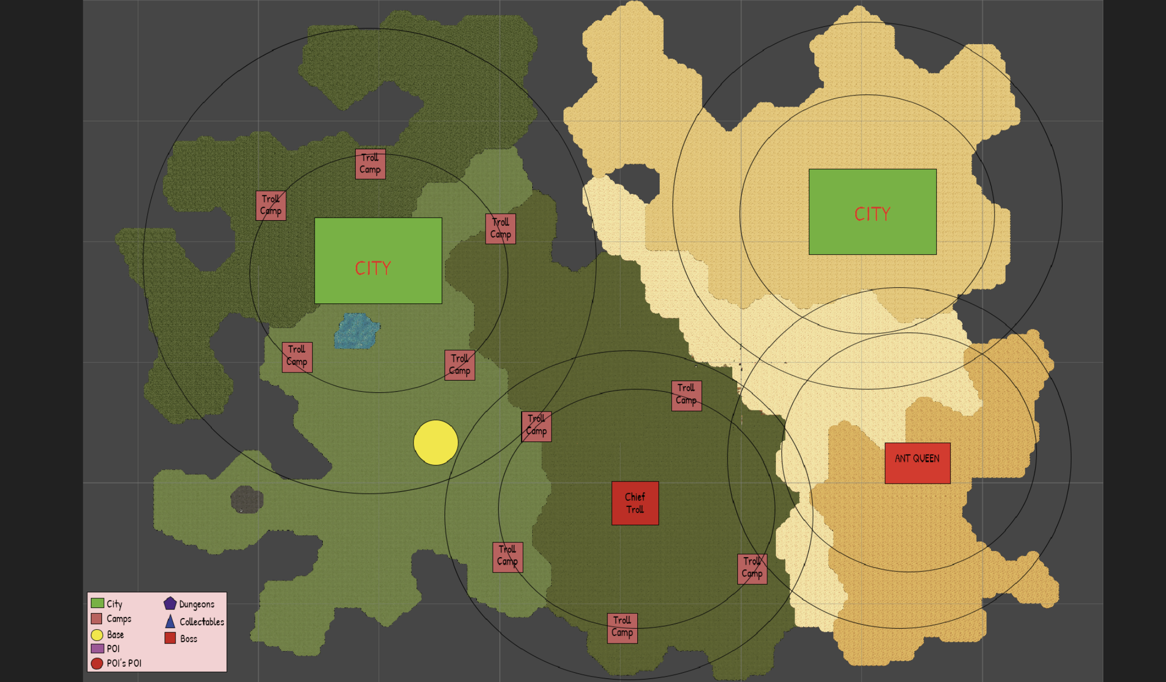 Also we wanted to distribute resources a little unevenly so that players will know where to go to find a specific resource/creature. We now have safe/normal/danger zones for biomes and cities always pop up in the safe zone while boss lairs pop up in the danger zone. We will distribute other resources and point of interest after some testing. THIS FEATURE IS NOT YET IMPLEMENTED but it will probably available on our next update.