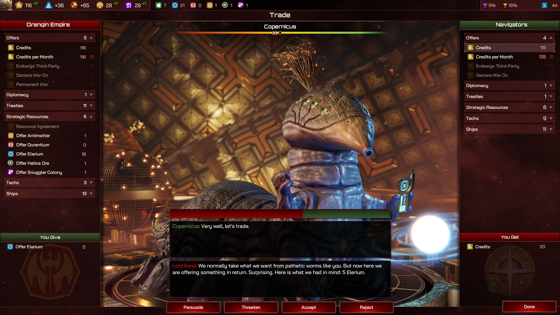 Credits can be used for barter in diplomacy, either to acquire other goods or to sweeten a Treaty proposal. Not sure I like this deal much though, those Navigators don’t seem very willing to part with their Credits here.