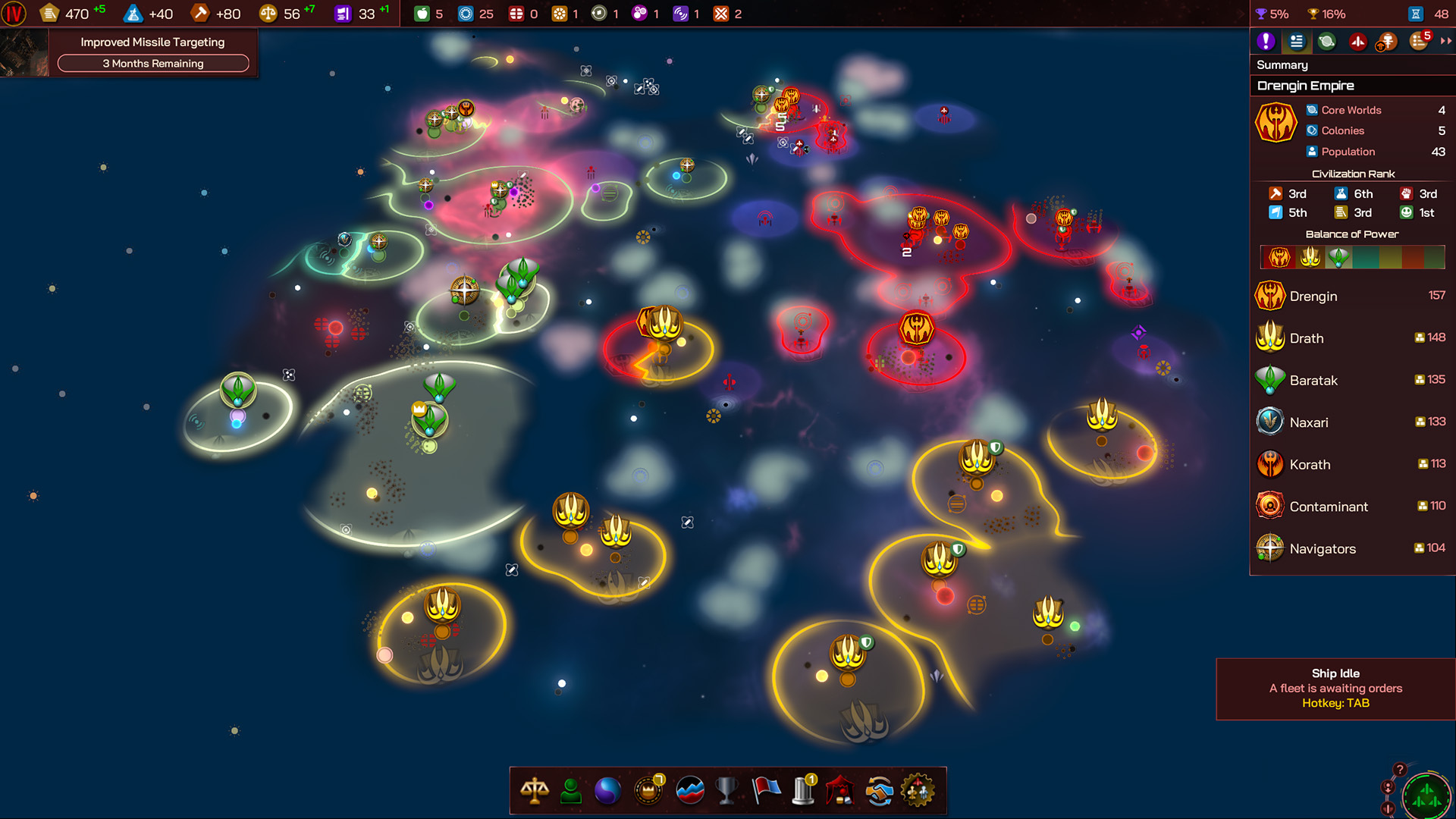 Going back to the Civilization Overview screenshot, you can also see some of the things Credits are spent upon: maintenance for your Ships, Colony Maintenance (stuff you’ve built on your Core Worlds), Starbases and the Credit cost of an Civilization Policies you have set.
