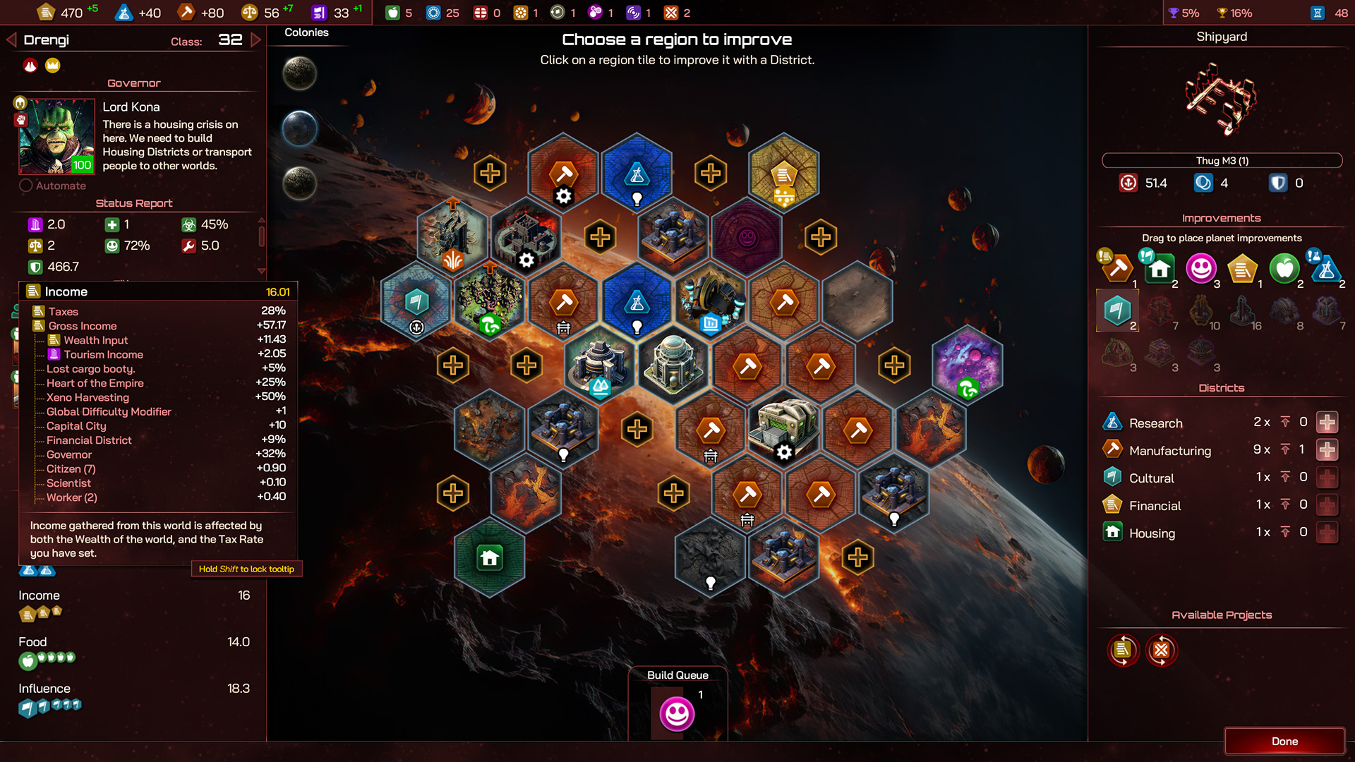 With the Credits earned from selling that Armor Module, Lord Kona can rush build a warship he needs. This will cost a lot of Credits but the faster you build your military, the stronger you’ll be. This will also cost some Control, and you’ll take a hit to your Approval too as your Citizens don’t much enjoy being forced to work long overtime, even if they are being paid extra for it.