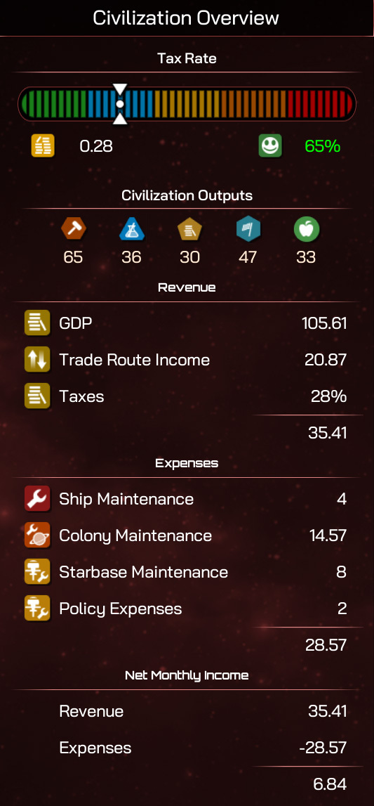Your tax-rate, set at the top level with the one rate affecting your entire Civilization, is then applied to this modified Wealth Input value as a multiplier to become a Core World’s Income.
