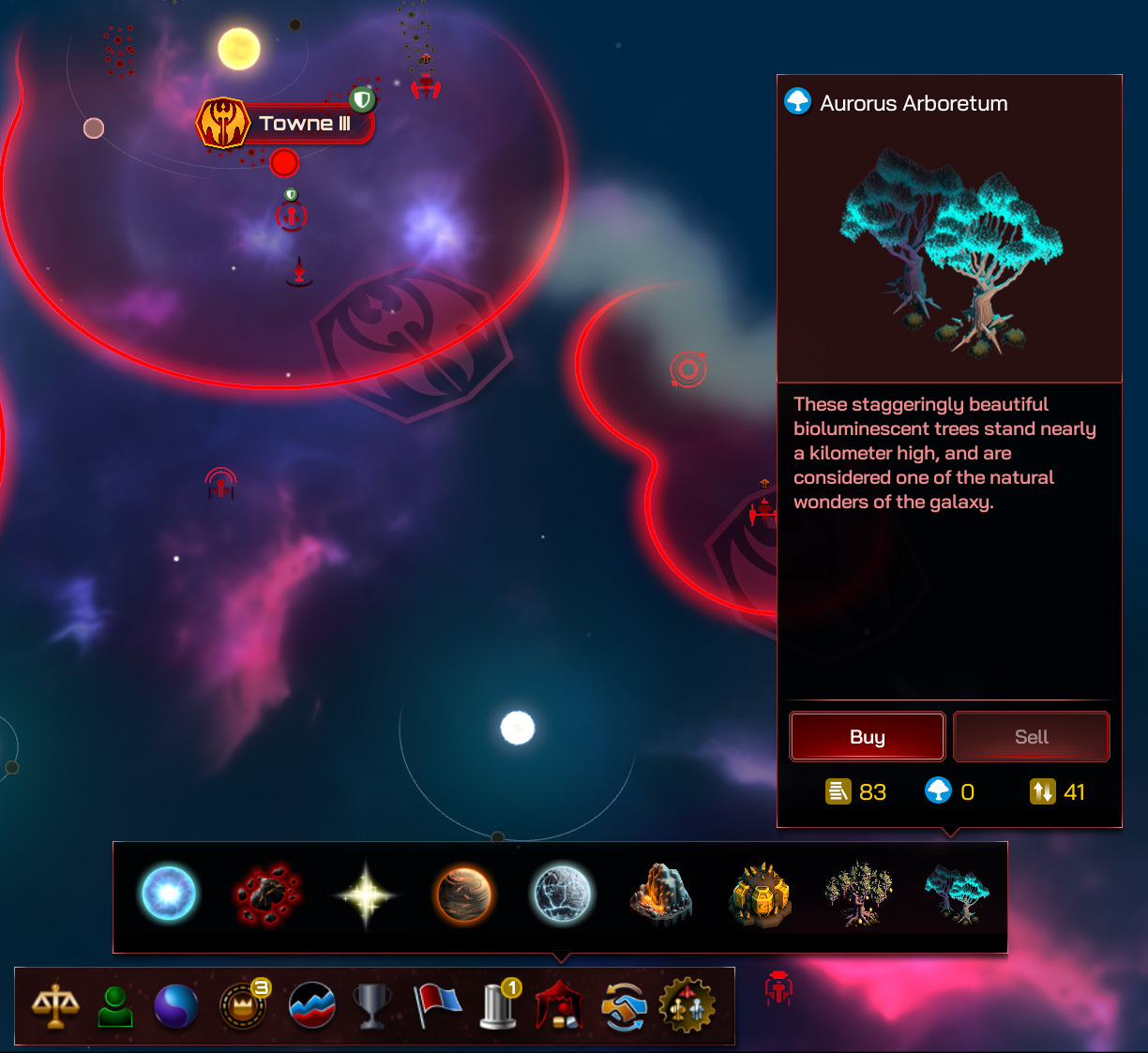 If you have excess Strategic Resources, you can sell them at the Bazaar in exchange for Credits, which is the preferred barter resource for the aliens who run it. Here they’re offering 83 Credits for each Aurorus Arboretum. Sadly, I don’t have any. Be aware that repeatedly selling the same resource will devalue that stock and reduce the Credits you’ll receive for each unit.