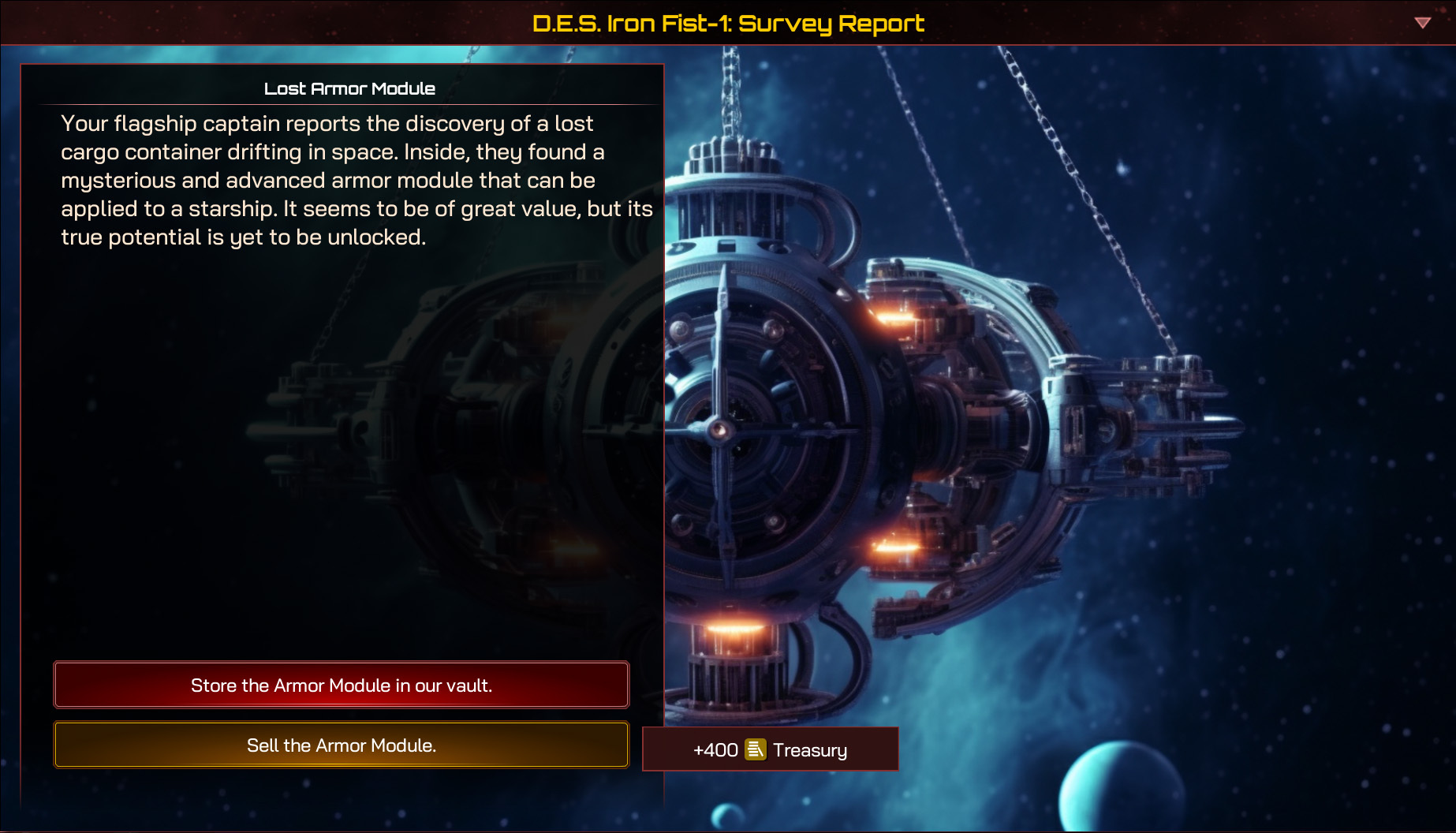 Certain Events, such as finding exotic Artifacts, modules or useful space junk, will give you the option to sell your new acquisition for Credits. This can make Survey a profitable endeavor for much of the game, so don’t neglect those Flag Ships!