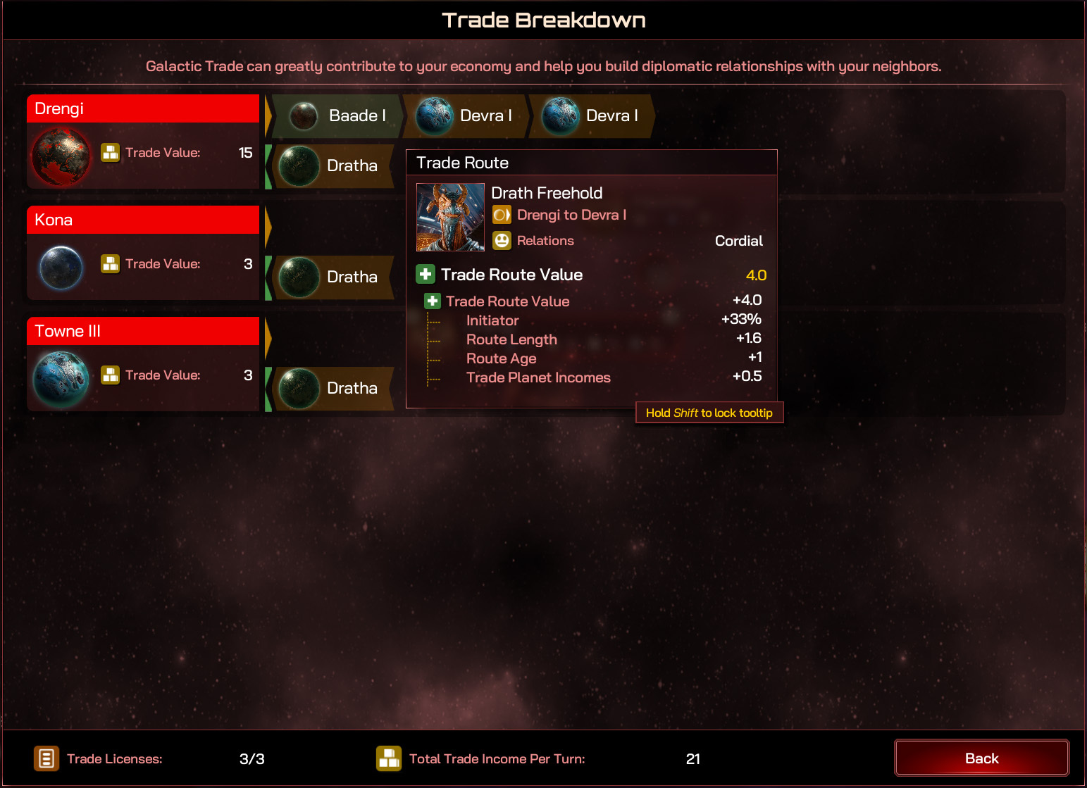 You can also see that you make Credits from the Trade Routes you set up by sending a Freighter from one of your Core Worlds to one owned by your neighbors. You can see the Trade Route UI below, with all the current Trade Routes set up between yourself and your trade partners.