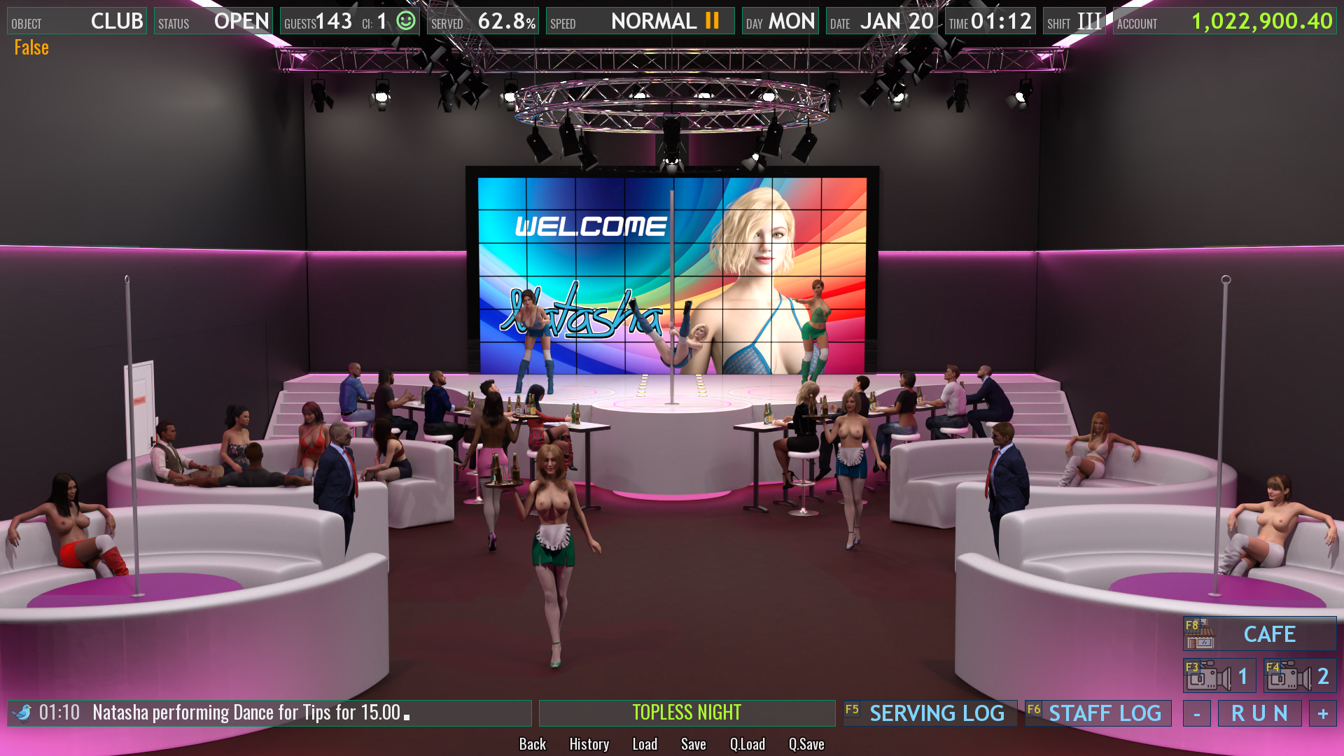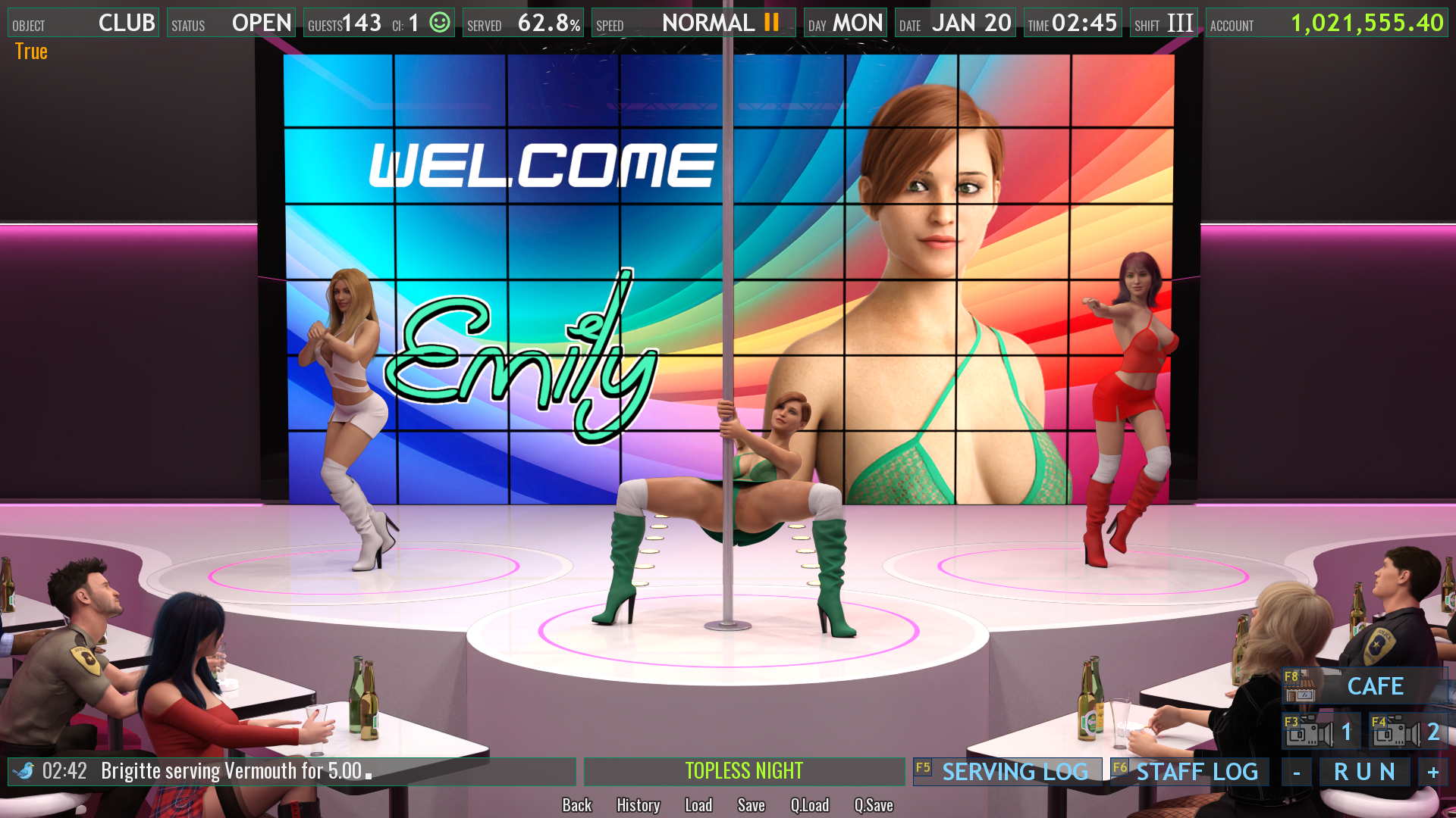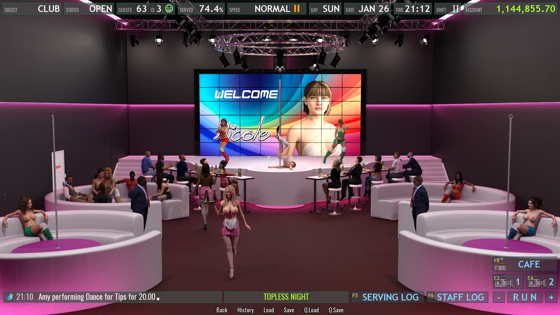 The Club view has two cameras... The first camera showing only the main stage where one girl is pole dancing, and two more dancing next to her.