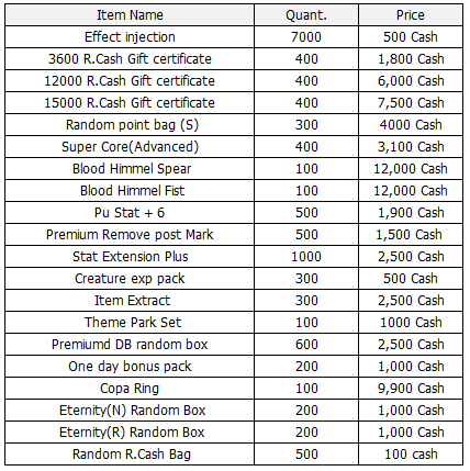 3) Happy Hour event(When you stay at the server at this time, you will get rewards) - 18:30 : Item compose - 19:30 : 2nd Gacha Ticket(1EA) - 20:30 : Random R.Cash Bag(S)
