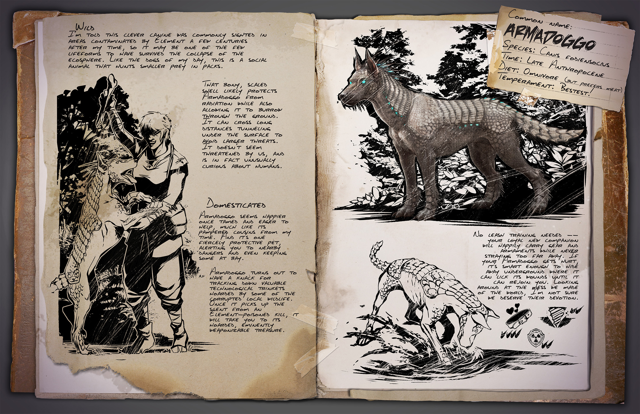 The goodest pup on the ARK, Armadoggo is a true survivor's best friend. More than just a tame, Armadoggo can be set in Companion Mode so you never have to worry about losing it. In Companion Mode, your Armadoggo will faithfully follow wherever you go, burrowing under the ground to reach you faster when the distance between you is too great as well as when it nears death's door. Instead of crossing the Rainbow Bridge, Armadoggo will dig deep into the ground to recover, ensuring it can always return to your side. A true faithful companion.