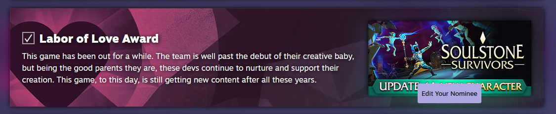If you enjoy Soulstone Survivors and like the work we have done so far please consider voting for it on the Labour of Love category for the Steam Awards 2024!
