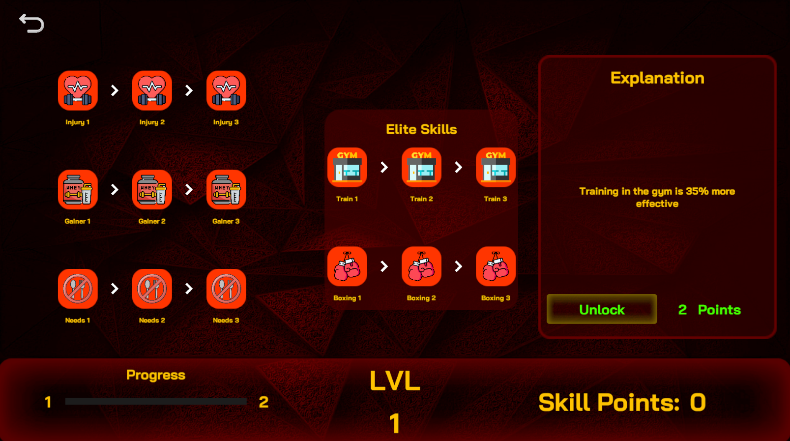 Earn skill points by leveling up through training and spend them to unlock powerful upgrades.