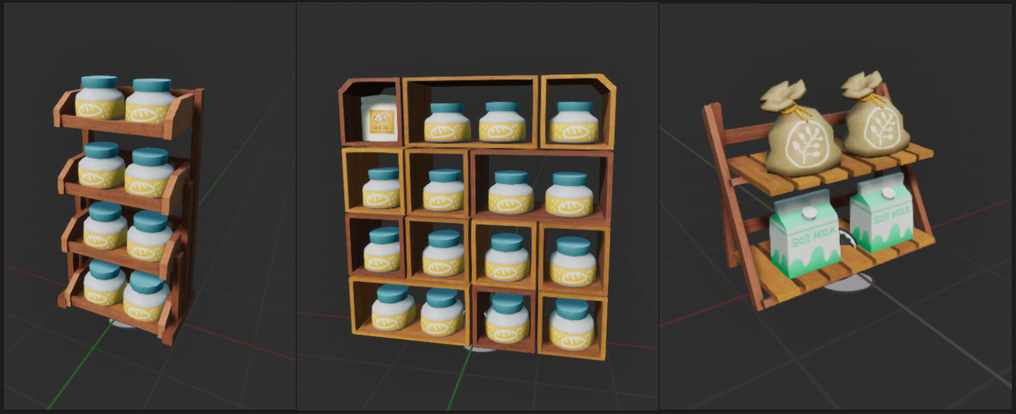 This month, I completely redesigned the model and textures for the display case. Compared to the previous narrow shape design, the new case better showcases the desserts and even includes adorable, small dessert stands that allow desserts to be displayed at a good angle.