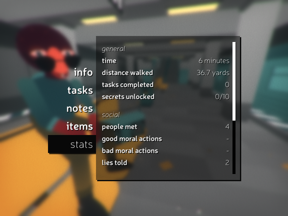 The Kingfisher Valley hub has been coming together nicely. I managed to add new locations, details and polish the level geometry. One of the new NPCs in this hub can give you different sidequests (in case your morale is low, otherwise he will send you away). I've added a taxi driver as well who can take you to different locations (including Hawkfields). A new city hub (Sparrow Hollow) is going to be accessible via this method only. You may remember a phone booth from the demo. I proudly announce that I've implemented a fully functional phone system with different numbers you can call. NPCs can either answer, miss, or even discard your calls - and this even dynamically changes depending on your current tasks, relations, etc. Completely reworked the input system to support customizing the movement keys as well. I can hopefully use this new system in Through The Fragmentation later on. Added new variables to the stats screen, so the game can account how many times you lied, stole a wallet, or rob a safe. Also, on the Settings/Interface panel, you can set whether you want to have the distance walked stat calculated in meters, or in yards. Worked on new websites you can visit to gather information related to different side quests, or secrets. Made sure that the game can remember which pages you visited, (in case an NPC mentions a website to you during a conversation, for example), and added alternative paths as well. I also made a special elevator for the game that functions as a teleporter between hidden areas. You need to find the codes to these areas, and sometimes even the way back to the City.