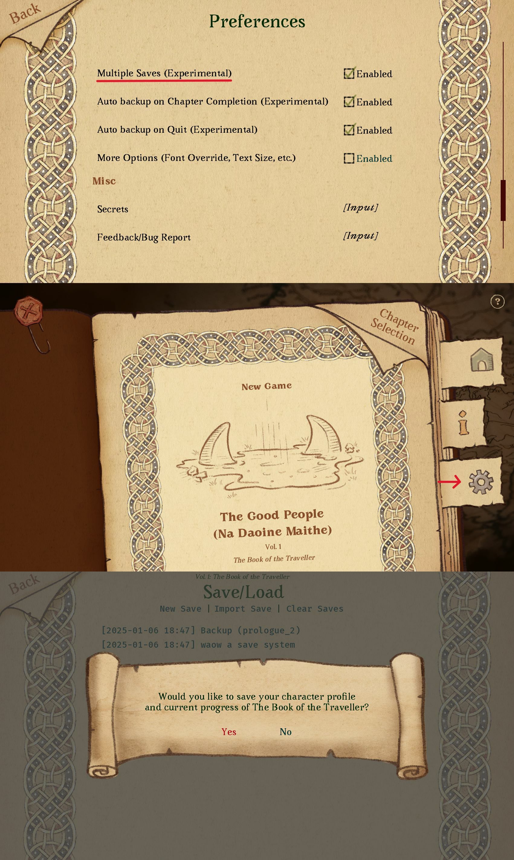Experimental Saving: If you go into settings, you can now turn on a saving feature that will allow you to save your choices in each book. This feature is still experimental, which means we're still working out how best to optimize it. Nevertheless: Once this feature is enabled, a gear icon will appear in the book menus for Volumes 1-7. Clicking this will take you to a menu that allows you to save your current progress, load an old save, delete saves, etc. Here's a visual guide: