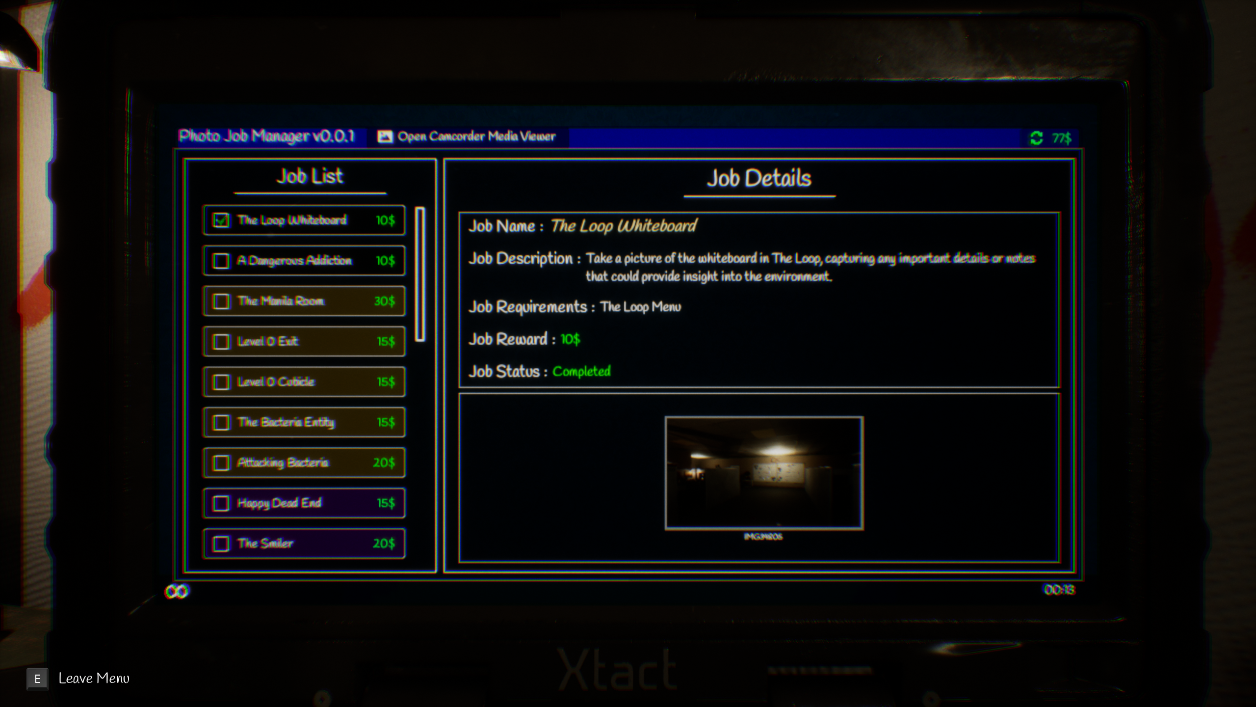 The job system can also be accessed through the special computer in The Loop. Each level offers a set of jobs, along with some that can be completed in any level. Jobs come with a variety of requirements—for example, some may require multiple photos, while others might demand several items captured within a single image. Upon returning to The Loop, players can claim their rewards and review their captured photos using the special computer.