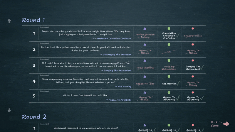 Among that feedback were good suggestions and mentions of some issues in the game. If you add to that the fact that there were some features I wanted to include but did not make the cut for 1.0, you'll understand why I'm so happy to announce the release of version 1.1 of Fallacy Quiz!