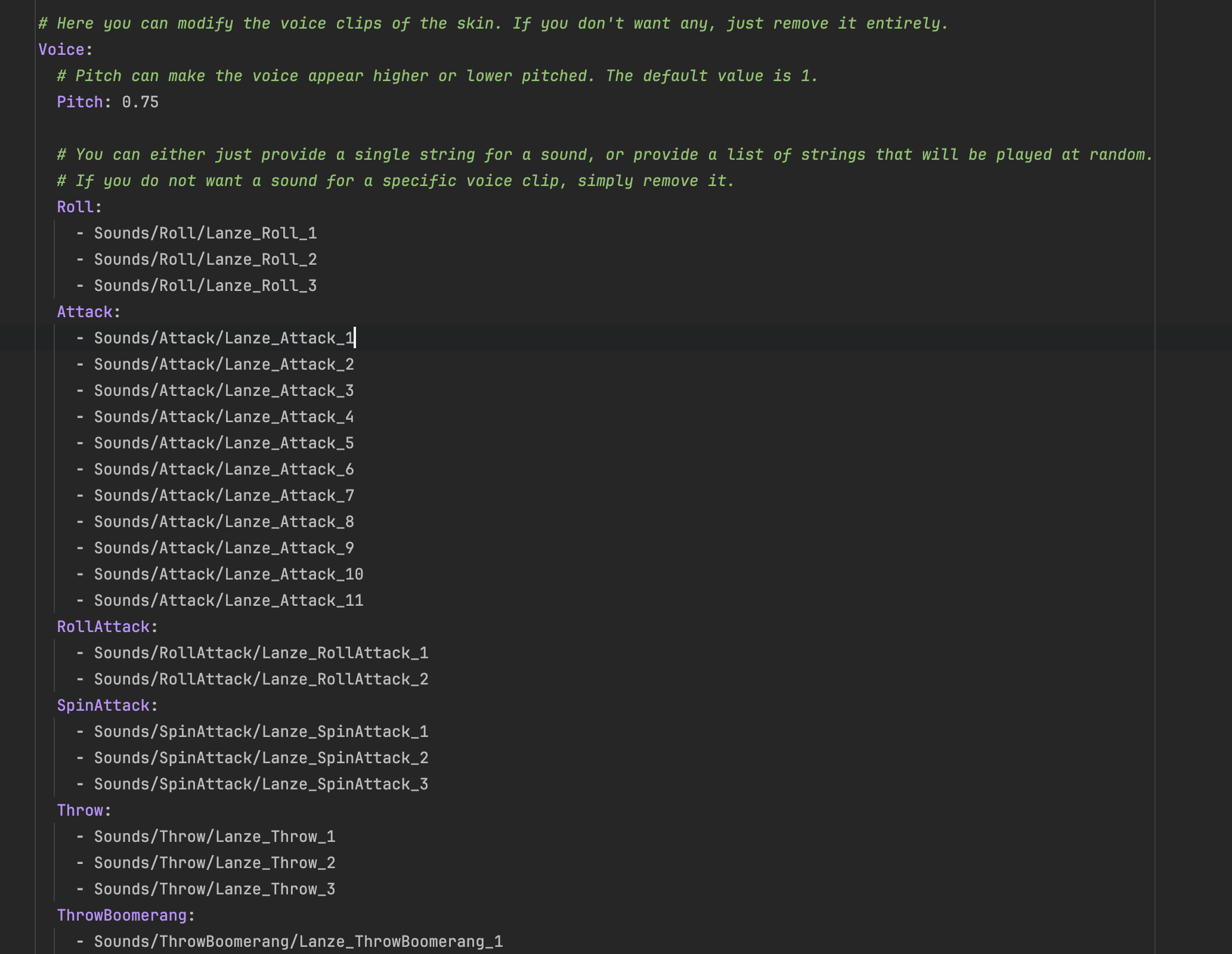Custom character skins can now specify custom voice sounds! The Dark Lanze example skin mod documents this.