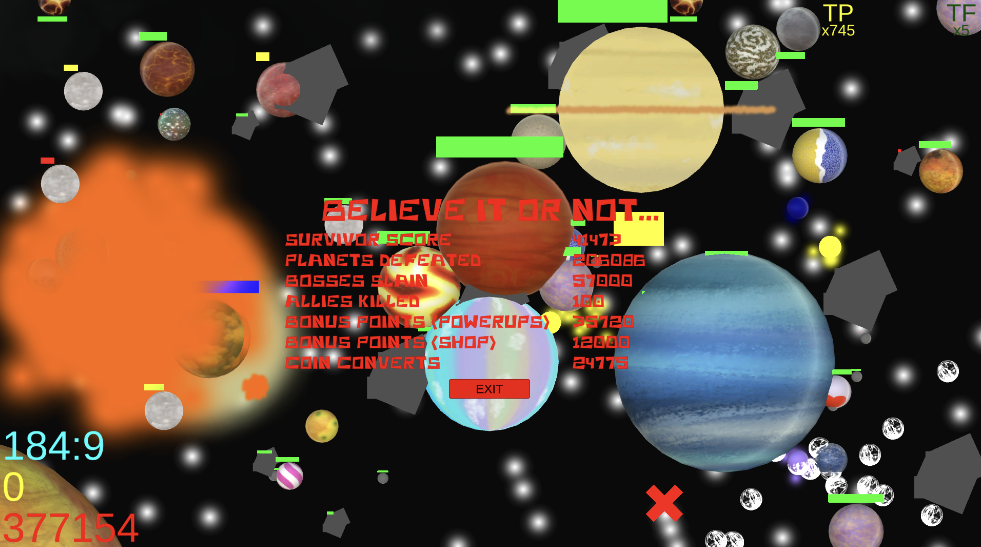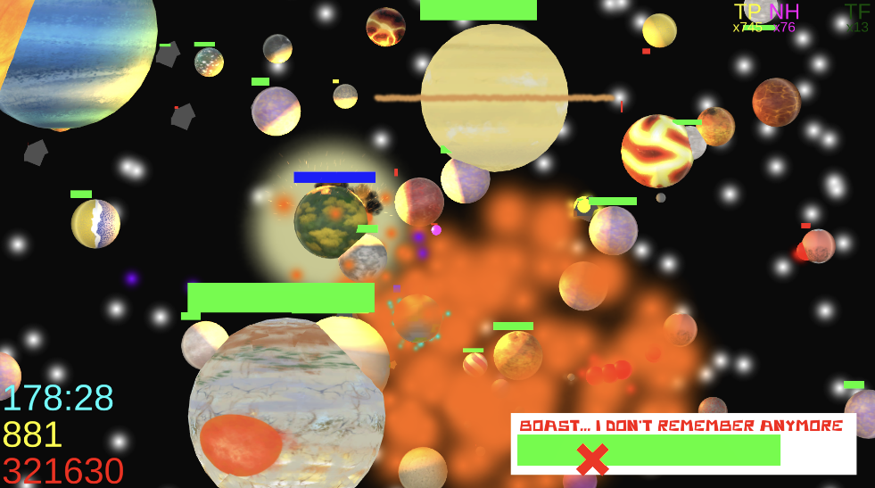 Epsilloni’s Sun Boss is the exception, though. I won’t have a climatic final boss for Tour Mode (at least for 1.0), so Epsilloni has normal health to compensate for that. In addition, once Epsilloni is defeated, players will stay put in that solar system.