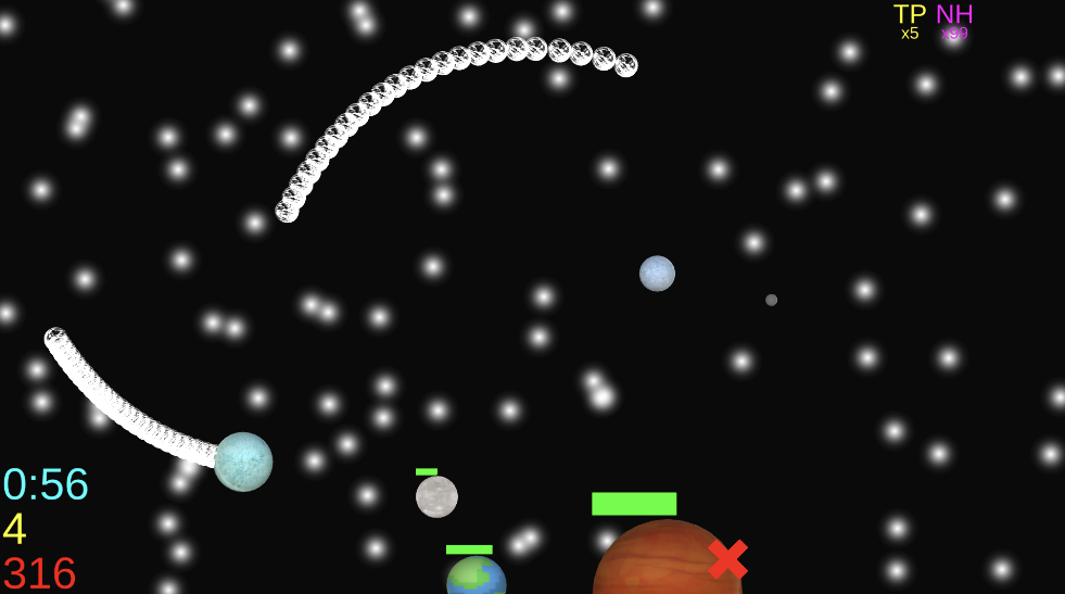 The main sequence planets themselves are large gas giants (with the exception of Crisp, which looks suspiciously like Mercury…), and likewise are slow-moving and come with a lot of health. Most of the moons come from these gas giants, with a record-setting 14 moons from Gargantua, which also happens to be the largest planet in the game, boasting a size twice that of even Jupiter!