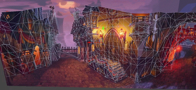 So, where do we start? Right! First and foremost, Bill paints a pretty scene with all the important objects in separate layers. Then we take the image and try to figure out where a camera would be if it were a real world environment. 🤔 That includes the camera's position, direction and view angle (or field of view). This is slightly challenging, because the world is painted with all kinds of twisty shapes, which makes it so unique, but also hard to align with the real world rules. When that is done, we go over each object in the scene and recreate their shapes in 3D and project their pictures on them. In the end, the scene looks identical to the initial picture from the camera's perspective, BUT that's where the magic happens ✨. This is what we have in the game engine: