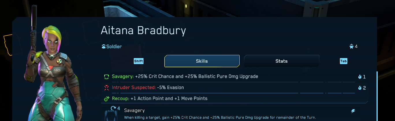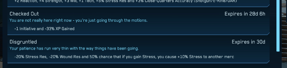- Merc Stress Limit Breaks now pop a confirmation window to show the timing and result of the LB - Stress Limit Breaks can now add 30 day negative Traits: Disgruntled and Checked out (or 6+ Discontent), Malcontent and Run Empty - New negative Traits can "ripple" Stress to other mercs - when a Malcontent Stresses, they make others Stress - Increased conditions in which a merc can Stress Limit Break for Less Loyalty or Pay Raise - Added Trait description to all temporary Traits (negative and positive) - Fixed issue with Passive Buff Talents firing when they are already active on your character (Recoup, Savagery) and wasting charges - Improved Cyber Knight's Lookahead Talent to focus on -Move Speed (max -30%) and not -Initiative (now removed) - Reduced level point cost of Agent EX's Armor EX upgrades 3 and 4 (-1 AP, +1 Charge) to 1 pt instead of 2 - Fixed reported map bugs